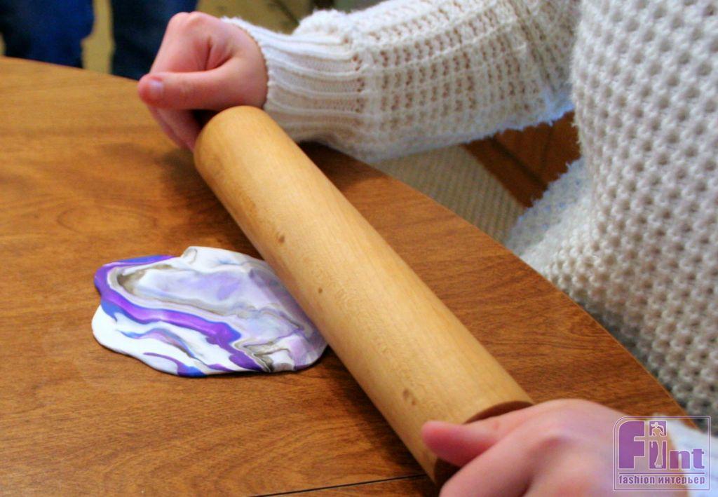 Скатайте скрученную глину в шар и раскатайте его при помощи скалки в плоский блин, толщина которого должна быть примерно 6 – 7 мм. Если вы почувствуете, что в изделии не хватает какого-то цвета, можете смело его добавить и заново раскатать блин.