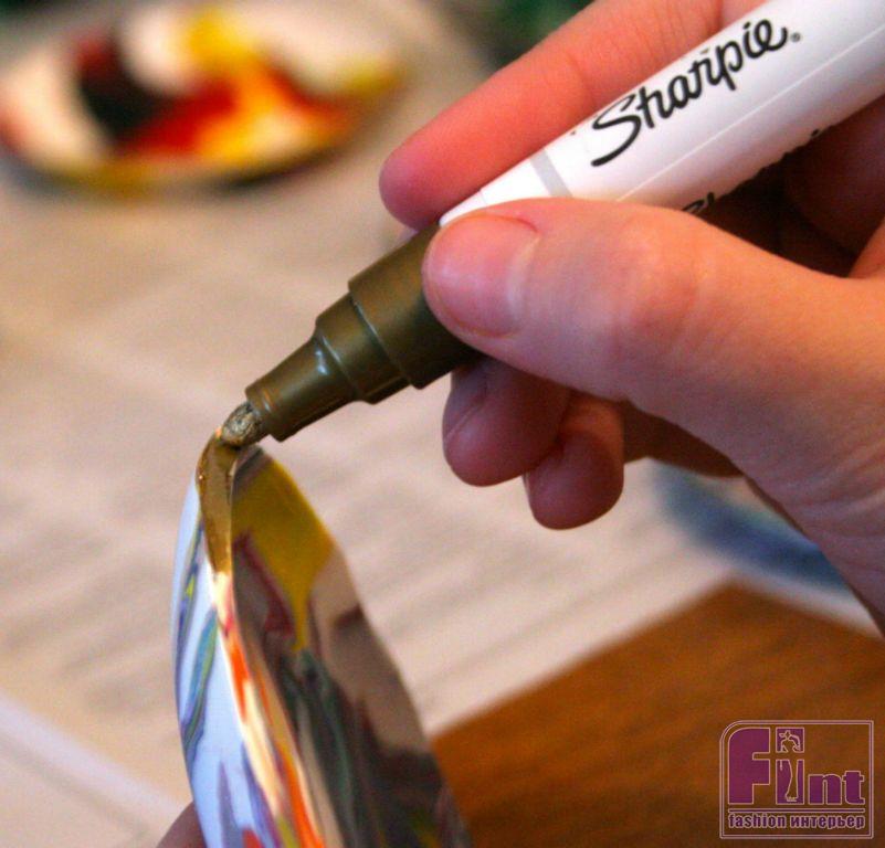 С помощью маркера на масляной основе золотого цвета оформите края глиняных тарелок. Мы решили не покрывать наши блюда глазурью, но вы можете добавить этот шаг, если хотите сделать их глянцевыми. Готово!