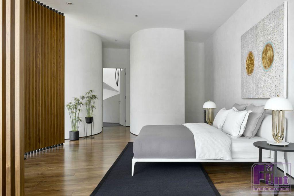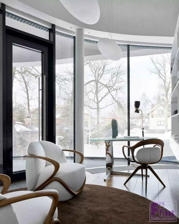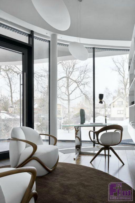 Пруд перед домом пробуждает дополнительный диалог между внутренним пространством и окружающей средой, благодаря чему природа как бы «втекает» в интерьер, растворяясь в нём. Однородность отделочных материалов фасада и внутренних стен дополнительно усиливает ощущение контакта экстерьера и интерьера дома.