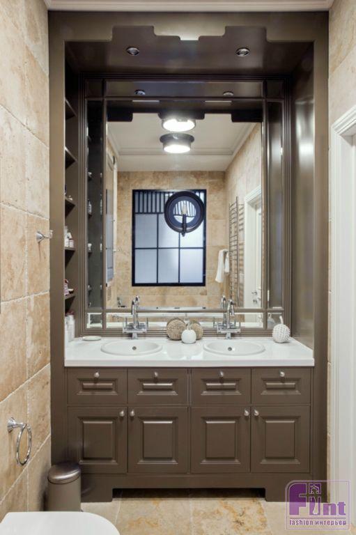 В дуплексе несколько ванных комнат. В санузле заказчиков натуральный травертин песочного оттенка. С ним отлично сочетается подстолье под две раковины, выполненное в мягком цвете молочного шоколада. В гостевом санузле использовали обои под покраску, покрытые лаком.