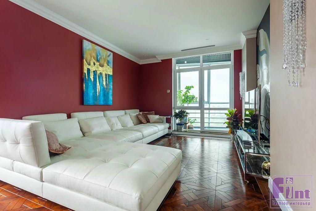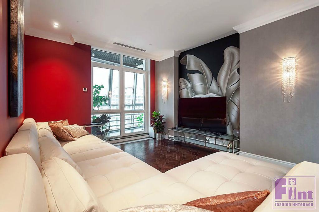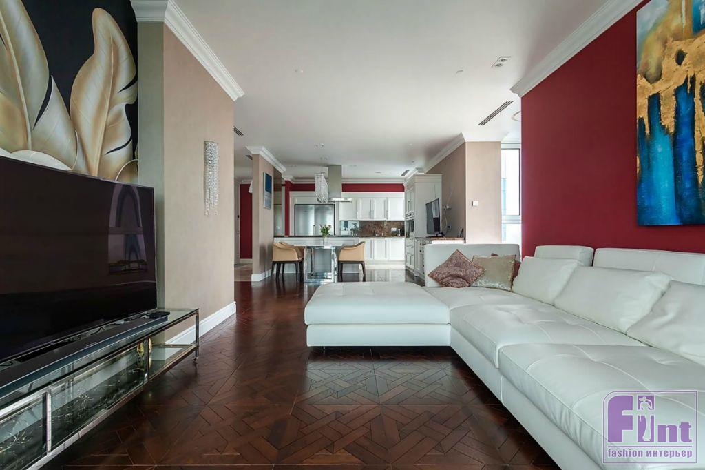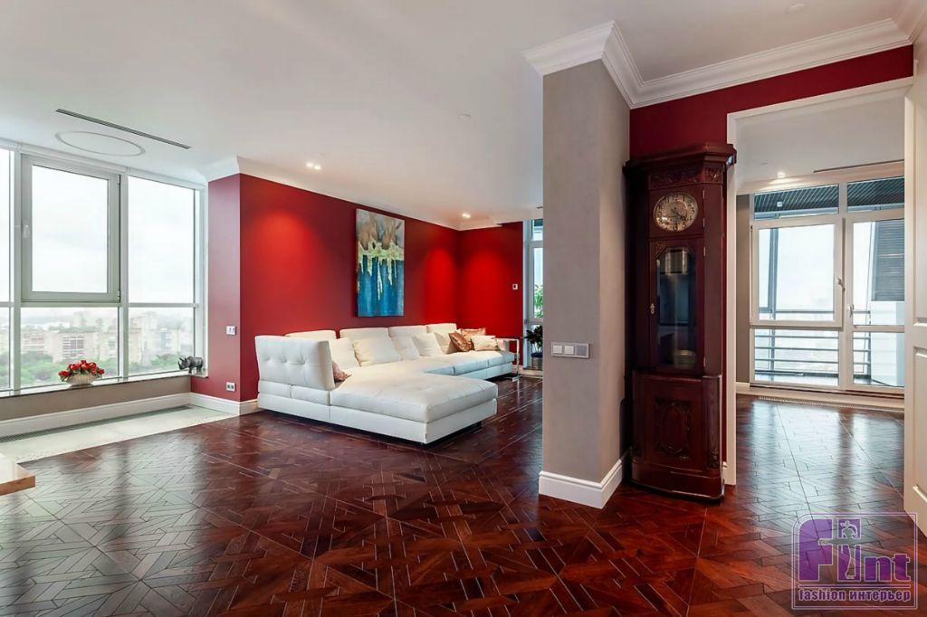Творческое задание обусловило выбор манеры — фьюжн. Дизайн «собирали» буквально по частям, вспоминает Диана. Яркие цветовые сочетания (красный, белый, чёрный) соседствуют здесь с не менее смелыми фактурными контрастами. Разнообразным получился и функционал квартиры: на 170 «квадратах» нашлось место совмещенной кухне-гостиной-столовой, отдельному кабинету, двум спальням, двум санузлам, гардеробной, будуару хозяйки и постирочной.