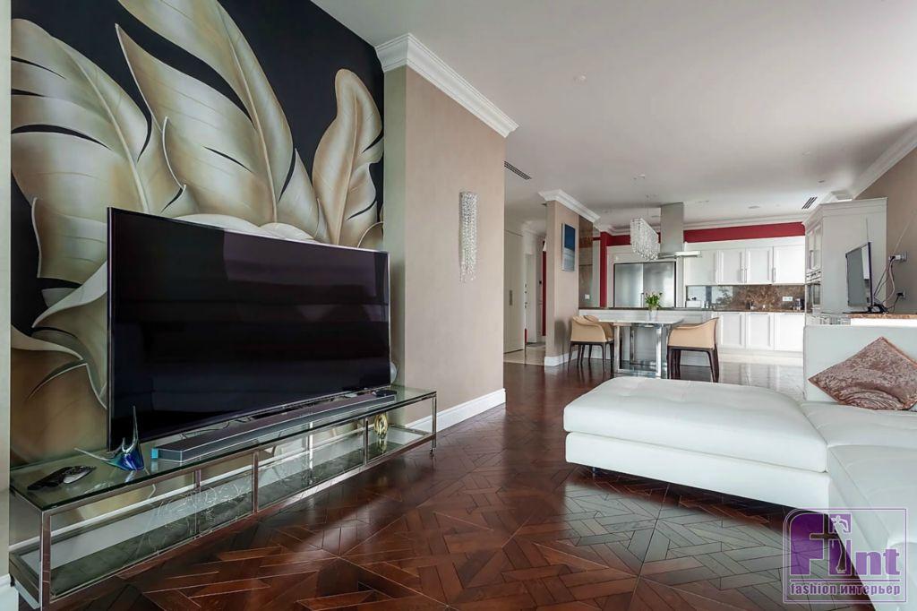 Для создания идеального и деликатного фона для предметов мебели и аксессуаров, Диана использовала экологически чистые и безопасные крашеные стены. Лишь в гостиной в зоне ТВ за телевизионной панелью Диана предусмотрела размещение декоративного панно с листьями, которое выполнено по технологии широкоформатной фотопечати.