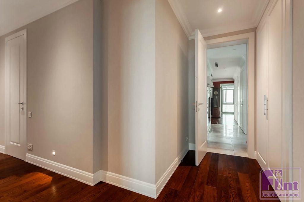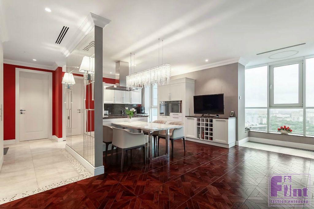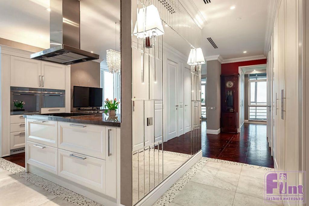 К кухне примыкает коридор, стены которого оформлены зеркалами и зеркальными панно, сделанными на заказ. Использование большого количества отражающих поверхностей в коридоре вполне оправдано, поскольку они помогли зрительно расширить узкое пространство прихожей и добавить ему света за счёт многократного отражения настенных светильников.