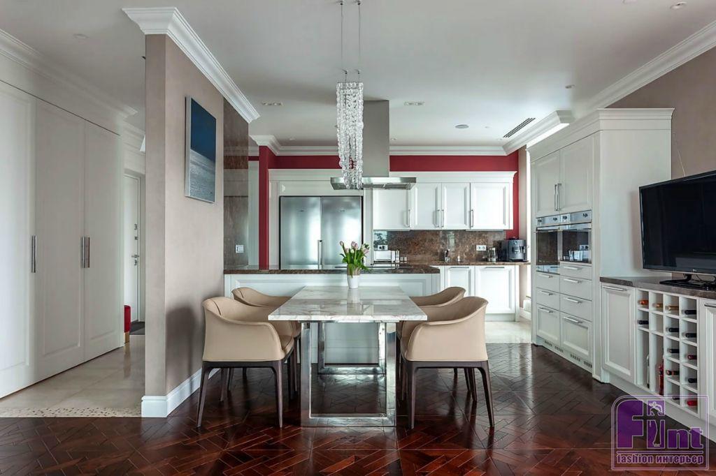 Кухня в проекте совмещена со столовой, плавно переходящей в гостиную. Кухонный гарнитур классического стиля в белом цвете отлично контрастирует с тёмно-вишнёвыми стенами и насыщенным оттенком пола в цвете венге. Интерьер столовой дополнен обеденным столом на металлических ножках и необычным дизайнерским светильником с большим количеством стеклянных подвесок.