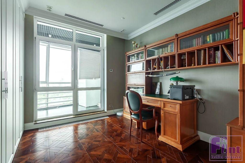 Ещё одним из пожеланий заказчика стал отдельный кабинет. Его дизайнер оформила в спокойных тонах с использованием мебели в классическом оттенке тёмного дерева. Одна стена кабинета полностью отдана под вместительную систему хранения, роль которого выполняет встроенный шкаф от пола до потолка. На противоположной стене, над рабочим столом, размещены открытые и закрытые книжные полки.