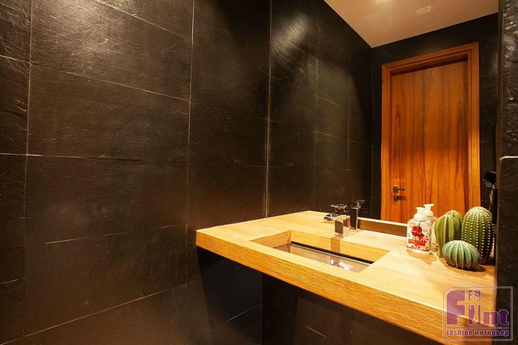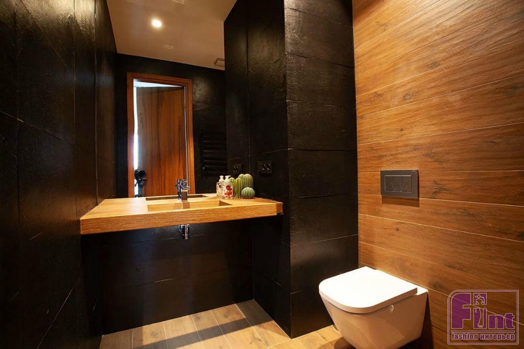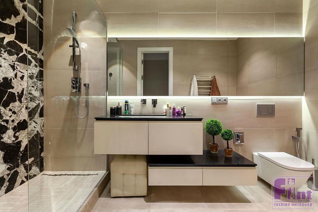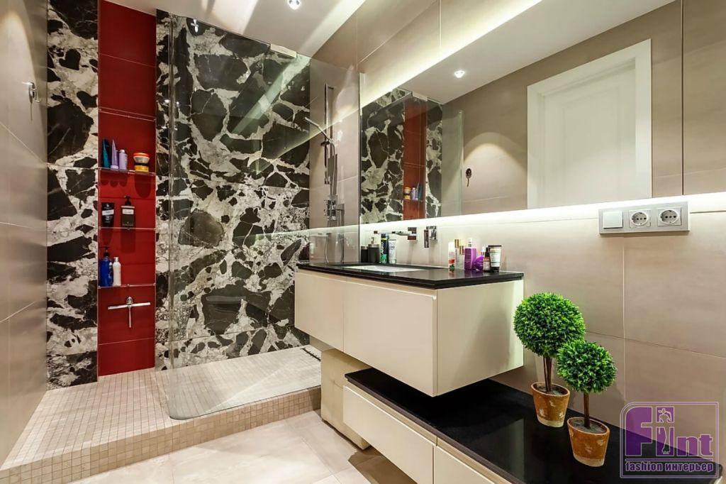 В ванной комнате источником для вдохновения для дизайнера послужила контрастная чёрно-белая плитка. Стена в душевой отделана тёмным керамогранитом с рисунком под классический итальянский мрамор. Цветовым акцентом выступает вставка из керамической плитки в благородном бордовом цвете.