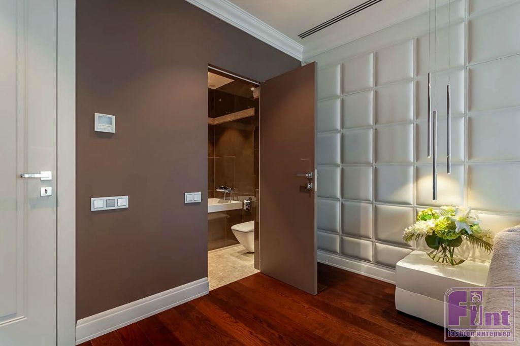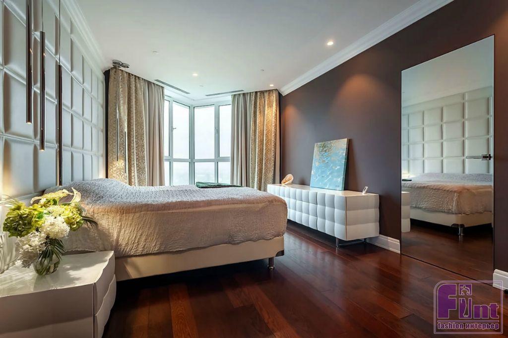 Хозяйская спальня – единственное помещение в квартире, дополненное шторами. Эркерное панорамное окно задрапировано плотными портьерами на специально изготовленных на заказ карнизах. Интерьер спальни также оформлен на контрасте светлого и тёмного, поскольку стены окрашены в глубокий терракотовый оттенок, а мебель, текстиль и аксессуары подобраны в светлой цветовой гамме. Стена над изголовьем кровати оформлена с помощью объёмных мягких блоков.