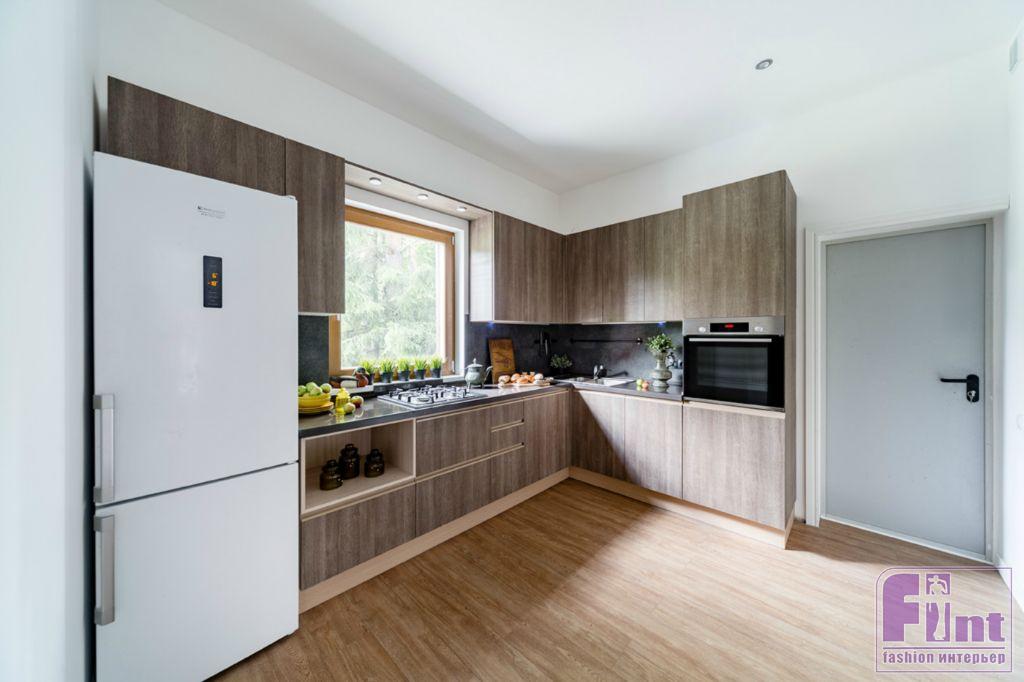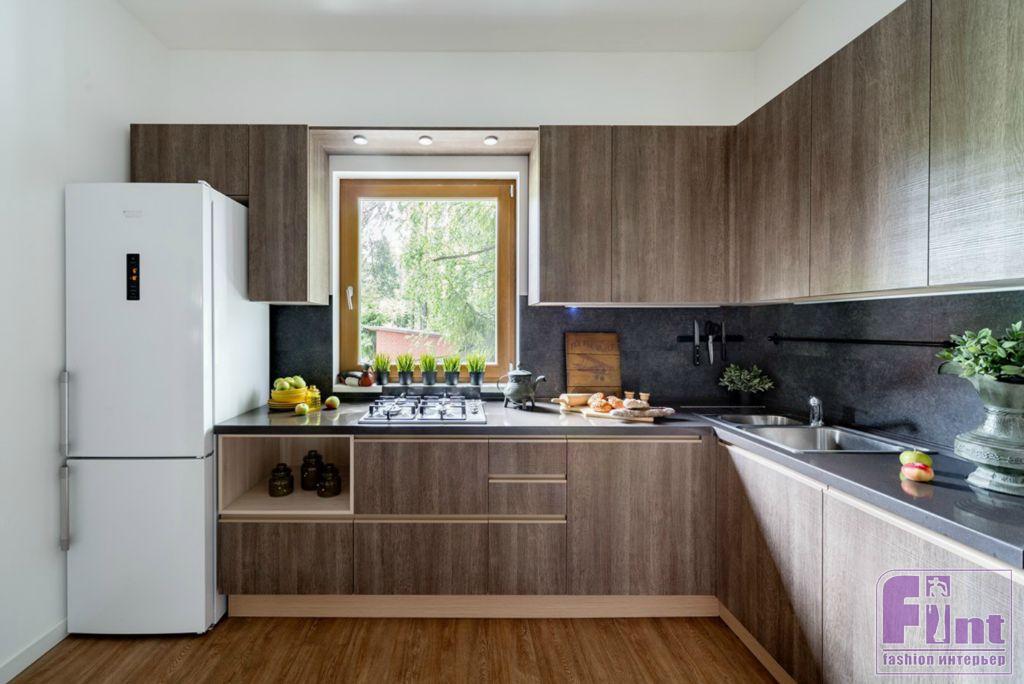Ну, и конечно же, нельзя не отметить эстетику модели. Внешность кухни отточена и сбалансирована. Строгий минимализм, «одетый» в природные фактуры – идеальный выбор для просторного дома. Фасады без ручек находятся в абсолютной гармонии с окружающим интерьером, а фартук и столешница «под камень» делают образ подчёркнуто-изысканным.