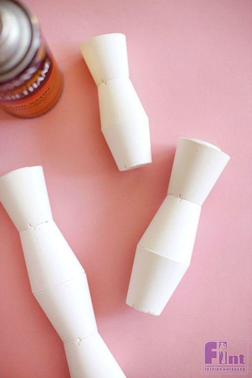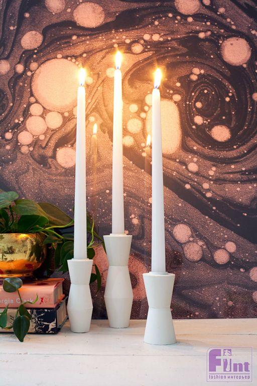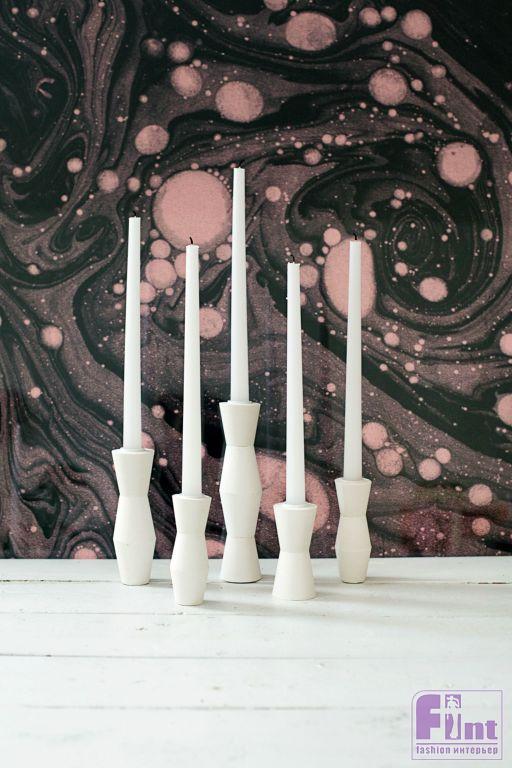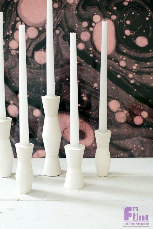 Шаг шестой. После того, как все корректирующие слои на изделиях полностью высохнут, наши будущие подсвечники можно покрыть двумя слоями белой полиуретановой краски, чтобы защитить их от влаги и предотвратить возможность растрескивания. Хотя, если вы использовали армирующую фибру «КРЕПЫШ», то за целостность изделия можно не беспокоиться. Им буквально можно будет забивать гвозди! Мы использовали для изделия чистый белый цвет и такие же белые свечи. Вы же можете проявить фантазию и окрасить подсвечники в матовый чёрный цвет, либо подобрать те цвета, которые будут сочетаться с цветовой схемой вашего интерьера.