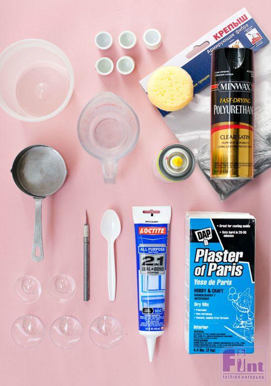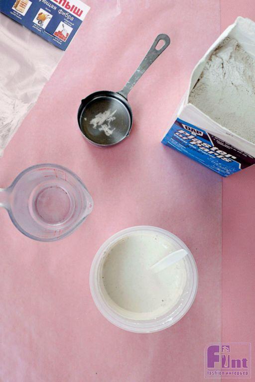 Шаг второй. Смешайте гипс строго в соответствии с инструкциями на упаковке (обычно рекомендуют использовать 2 части гипсовой смеси на 1 часть воды) и немедленно вылейте получившуюся смесь в подготовленные стаканчики, немного не доливая гипсовый раствор до краёв стаканчиков. Это необходимо для того, чтобы на следующем этапе погрузить в гипсовый раствор колпачки-заглушки для ПВХ труб. Немного постучите дном каждого стаканчика об стол, чтобы выгнать пузырьки воздуха из гипсовой смеси. Чтобы ваши изделия были такими же прочными, как камень, в воду добавьте несколько грамм армирующей фибры «КРЕПЫШ». После размешивания, она отлично разойдётся по раствору и будет его надёжно армировать.