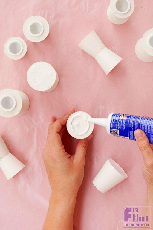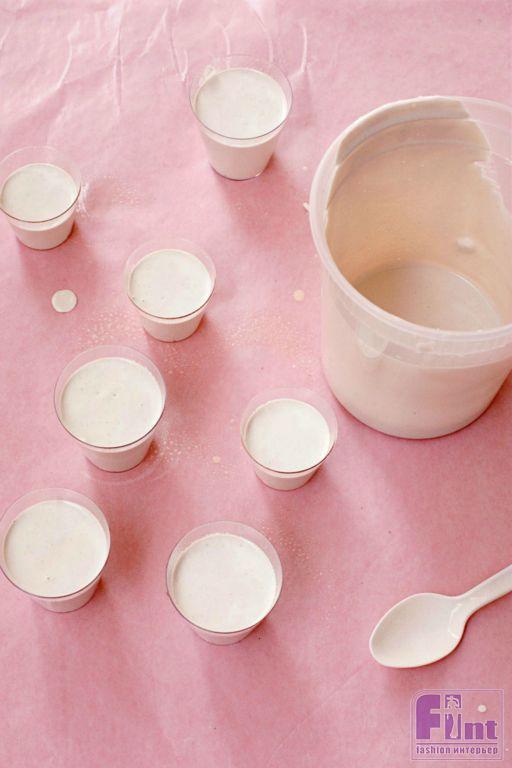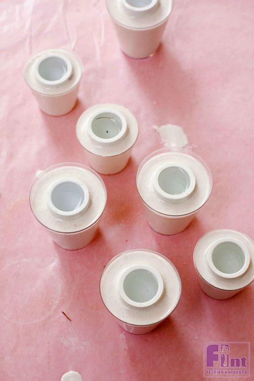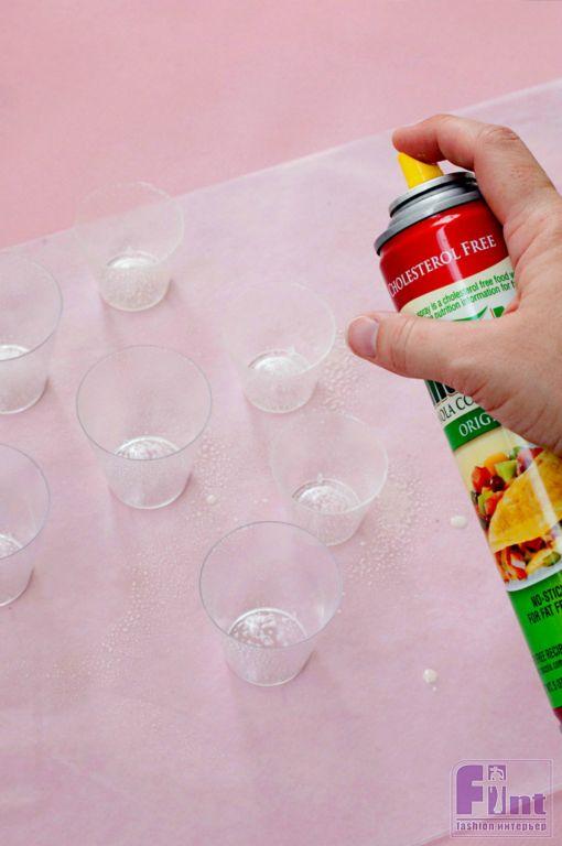 Шаг первый. Приготовьте свои импровизированные пресс-формы из стаканчиков-стопок, обработав их антипригарным спреем, чтобы гипс не пристал к их поверхности. Если антипригарного спрея у вас нет, воспользуйтесь обычным растительным маслом. Это нужно для того, чтобы наши пресс-формы легко отошли от гипсовых деталей и не раскрошили их.