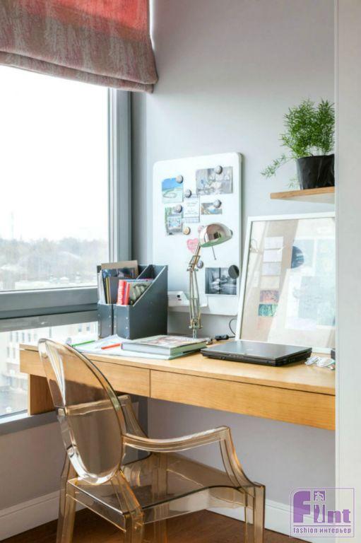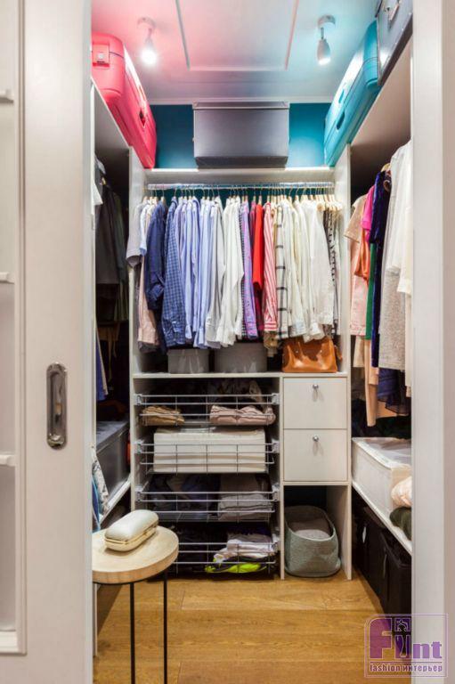 Одним из них была детская, под которую в проекте сразу выделил отдельную спальню. Другую комнату разделили перегородкой на приватную и общественную часть. Так удалось выделить место и под рабочую зону, и под скромный по габаритам, но довольно вместительный гардероб. Кстати, в этот гардероб можно довольно легко попасть прямо из хозяйской спальни.