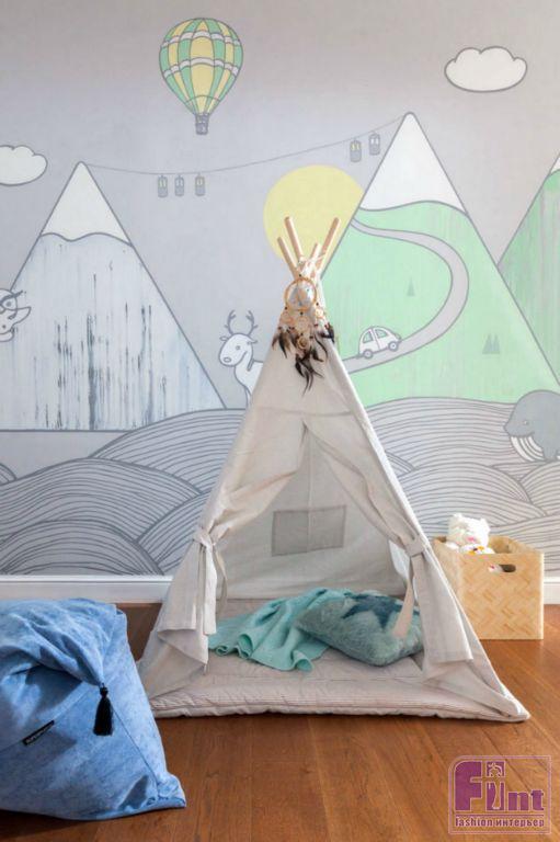 Детскую комнату оформили «на вырост». Интерьер детской настолько универсален, что в нём комфортно будет жить ребёнку любого возраста, от малыша и до подростка. Стены детской комнаты украшают авторские фрески, а мебель не загромождает пространство, освобождая центр комнаты для активных детских игр.