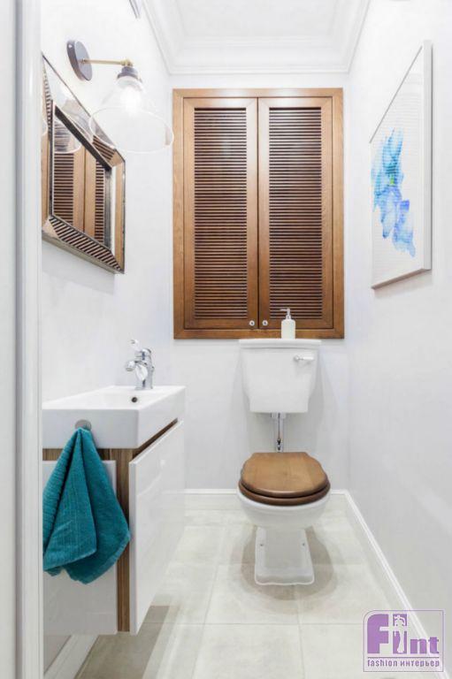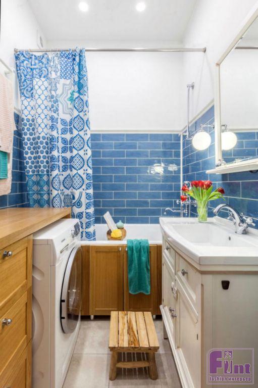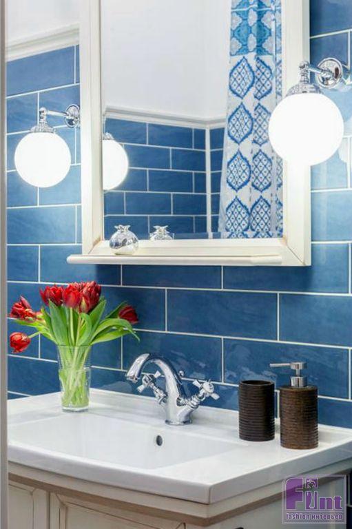 В ванной использована та же плитка metro, что и на кухонном фартуке, но для ванной комнаты был выбран более насыщенный оттенок лазурного синего цвета. Цвет плитки отлично гармонирует со множеством деревянных поверхностей и с чистым белым цветом мебели, сантехники, верхней части стен и потолка.