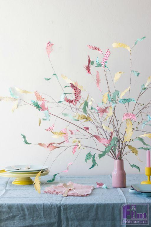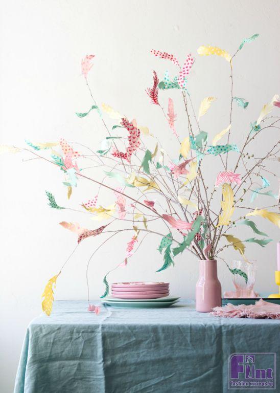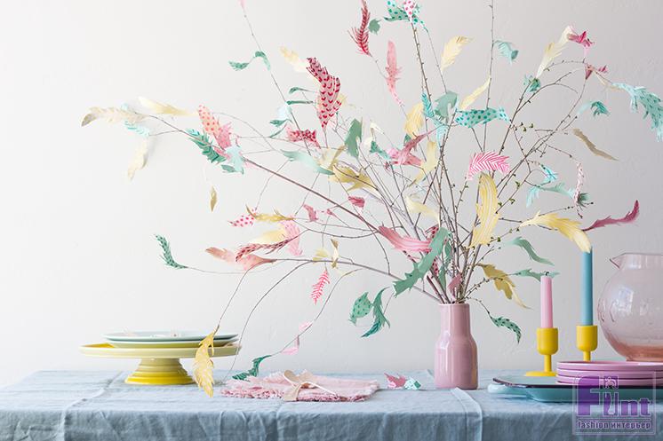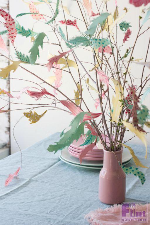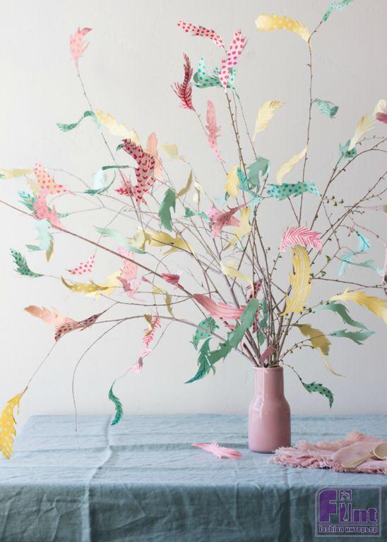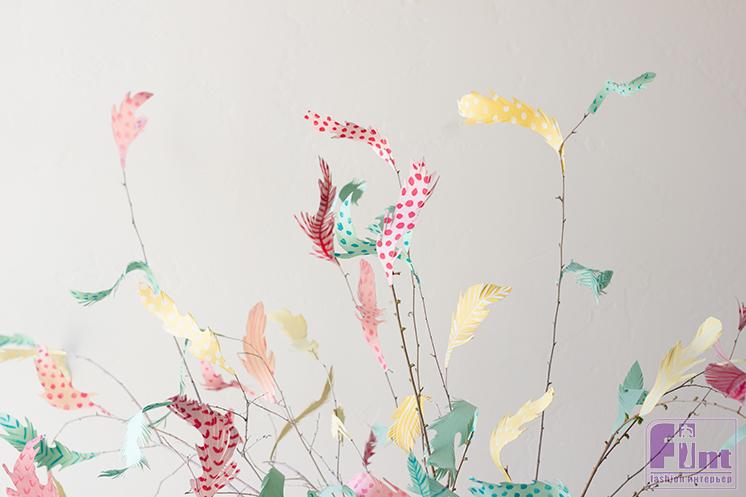 В качестве украшения для веточек шведы чаще всего используют яркие окрашенные птичьи перья. Мы же трансформируем эту идею и сделаем птичьи перья из цветной бумаги, используя рисованные шаблоны для вырезания перьев. Чтобы наши пёрышки были яркими и разноцветными, мы будем их дополнительно декорировать при помощи акриловых красок.