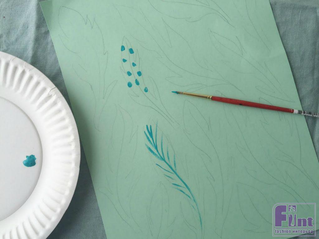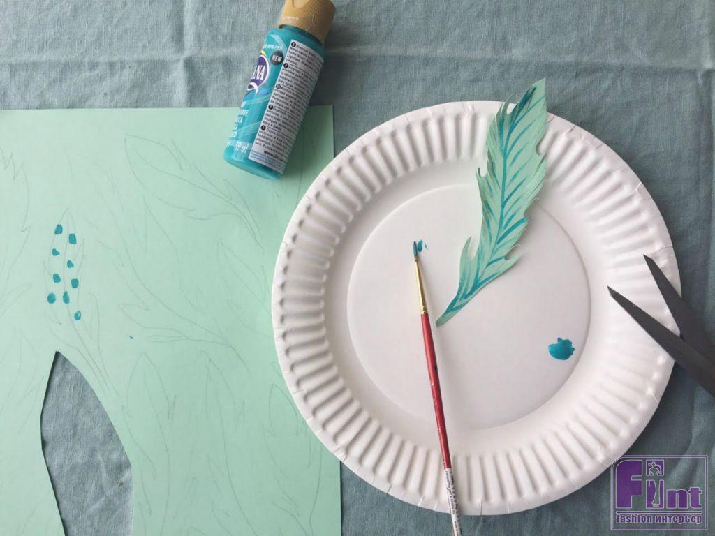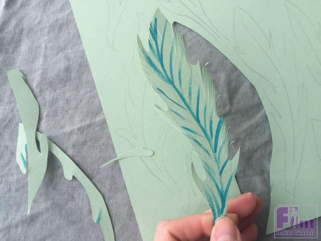 Чтобы наши перья стали непохожими друг на друга, их необходимо раскрасить, используя акриловые краски. Включите свою фантазию, или повторите узоры и орнаменты, которые использовали мы при декорировании шаблонов птичьих перьев. В качестве декора можно использовать имитацию прожилок на листьях, орнаменты горошек, зигзаг, полоски и т.п.