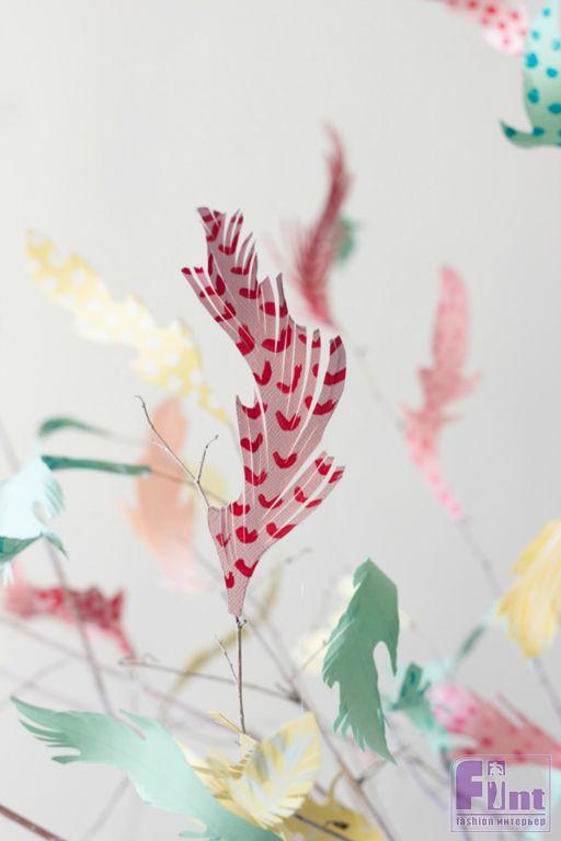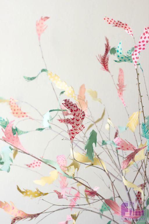 Возьмите подходящую по размеру, форме и цвету вазу и установите в неё ваши берёзовые веточки. Затем, используя клеевой пистолет, приклейте в произвольном порядке заготовленные ранее бумажные перья. Старайтесь, чтобы перья равномерно расположились на веточках, формируя красивое «дерево».