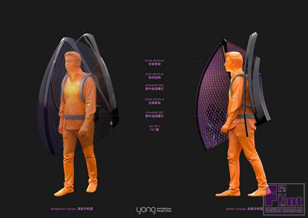 Источником вдохновения для этого изобретения Сун Дайонга стали крылья летучих мышей, с которых предположительно и началось распространение коронавируса. Выполненный из углеволокна и ПВХ-плёнки, щит испускает ультрафиолетовое излучение, обеззараживающее воздух вокруг своего владельца, и при необходимости легко складывается.