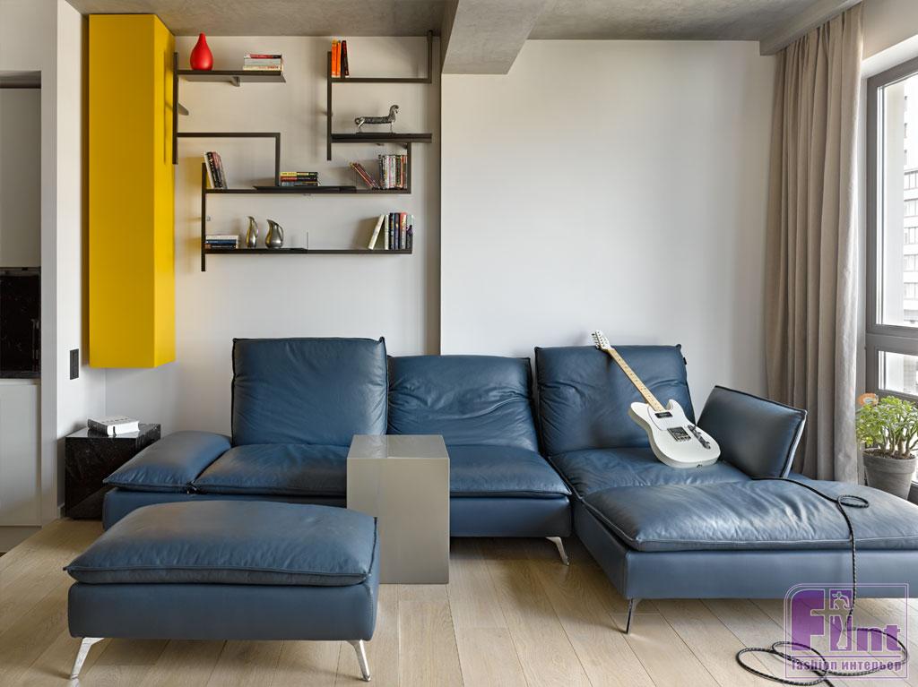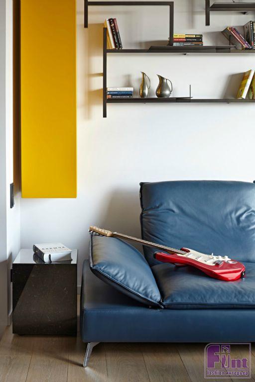 Многие элементы интерьера и детали мебели были изготовлены для этого проекта на заказ. Так, по эскизам и размерам дизайнера была сделана оригинальная тумба под телевизор. С этой тумбой отлично сочетается серийная подвесная тумба акцентного жёлтого цвета, размещённая в зоне дивана, напротив телевизора.