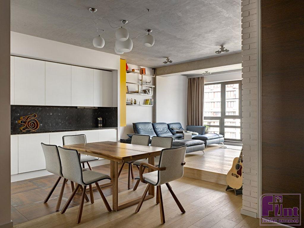 «Прежде всего, мы стремились создать современный интерьер, — рассказывает Никита. — Он получился эклектичным и немного лофтовым». За «лофтовость» здесь отвечают стена с кирпичной кладкой, имитирующий бетон потолок и тёмные открытые полки. Однако главный цвет в квартире всё-таки белый, его «разбавляют» пятна жёлтого, синего и красного цвета.