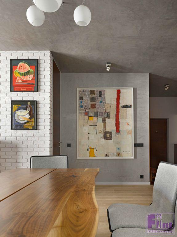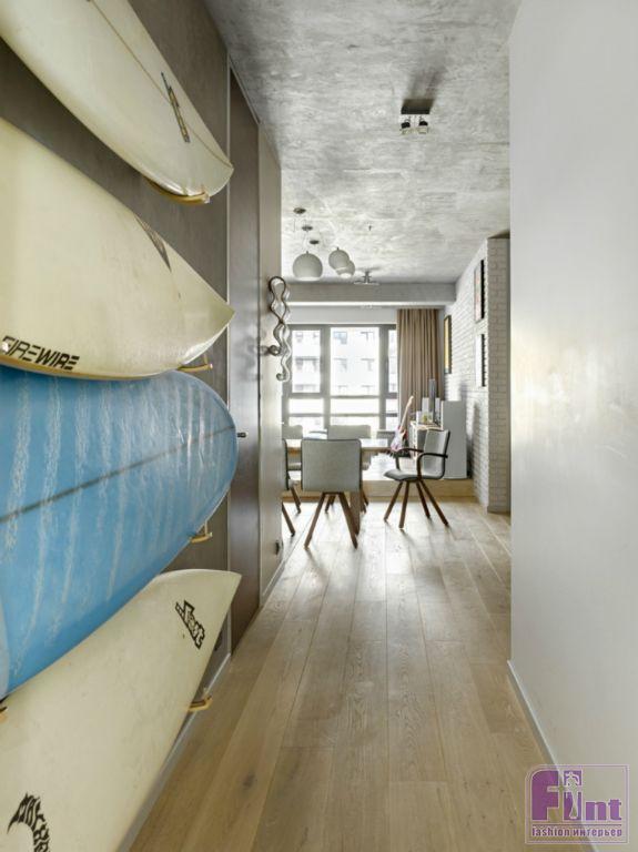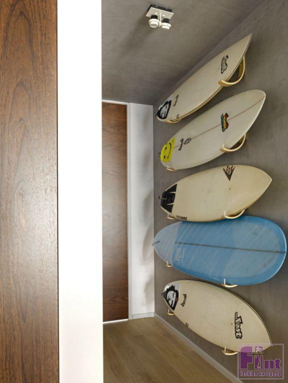 Дизайнеру Никите Ковалёву предстояло создать яркий интерьер для молодой семьи московских финансистов. Умеющие работать и отдыхать заказчики мечтали об интерьере, который в полной мере отражал бы их увлечения. Сделать это оказалось несложно. Семейная пара любит активный отдых, занимается серфингом, поэтому под любимые хозяевами доски для серфинга в проекте выделили специальное место, практически сразу при входе. Кроме этого, хозяин увлекается игрой на гитаре. Учитывая это, Никита предусмотрел в гостиной пространство для электронной аппаратуры и музыкальных инструментов хозяина.