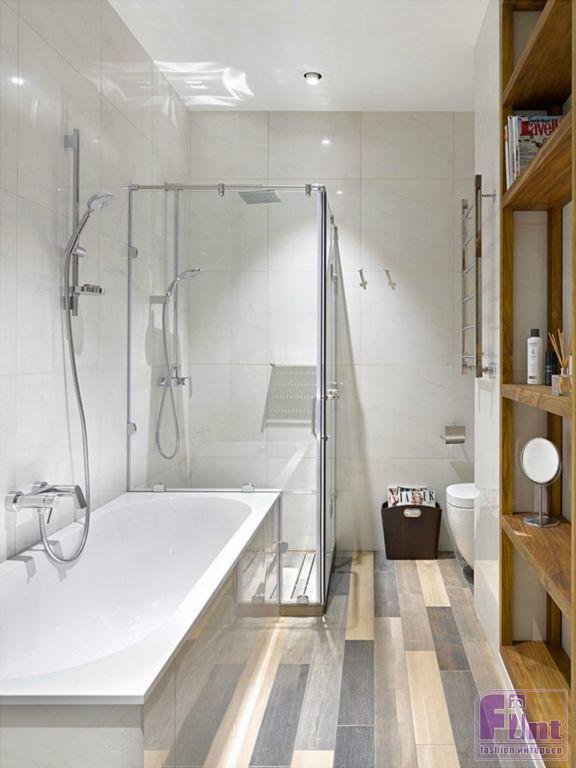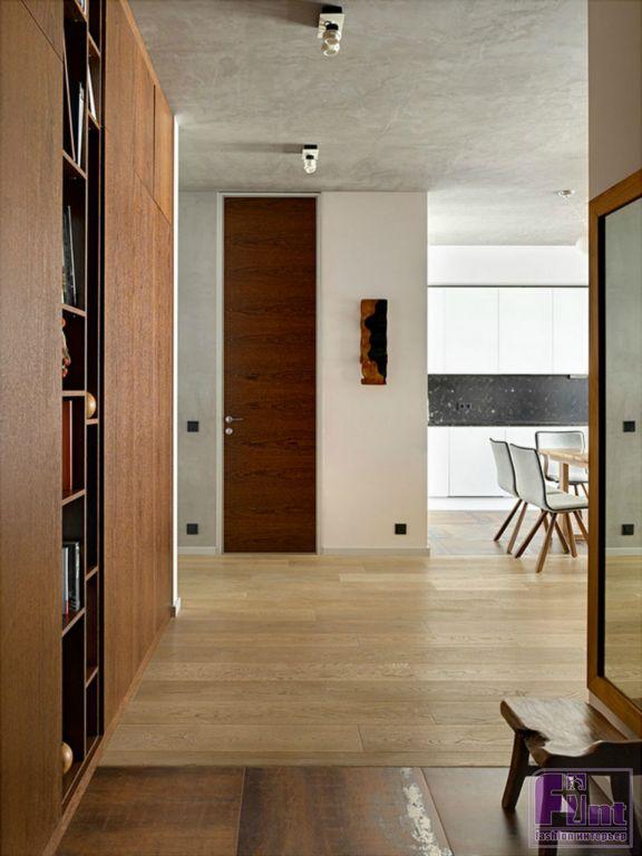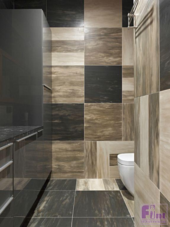 Одно из нестандартных решений, которые применил дизайнер в этом проекте: необычные дверные проёмы, заполненные от пола до потолка. Поэтому, все дверные полотна и дверные коробки были изготовлены на заказ. В квартире две ванные комнаты, при обустройстве которых использовался стильный по форме и расцветке керамогранит.