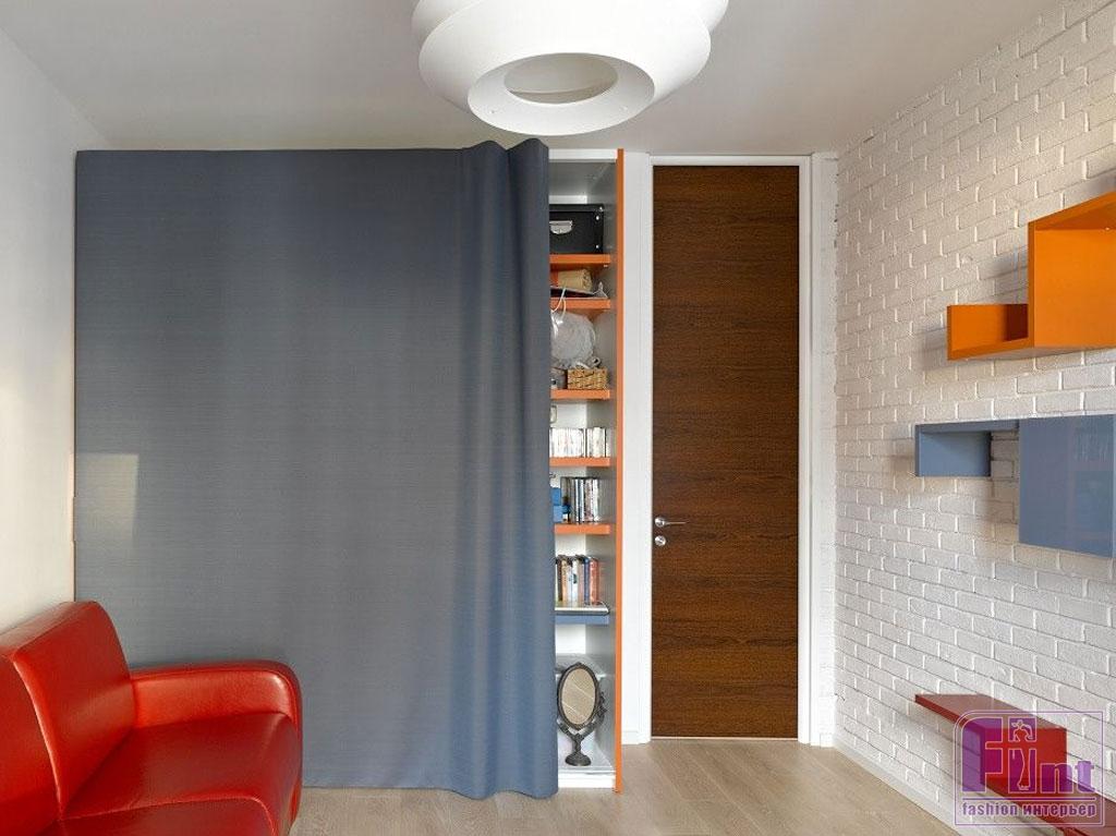 Под кабинет отвели отдельную комнату, которая со временем может превратиться в детскую. В кабинете дизайнер использовал нетипичное решение: шкаф с тканевым фасадом. Чтобы не загромождать пространство, дизайнер предложил установить в кабинете открытый стеллаж, фасадом для которого выступила плотная портьера. Большая часть мебели, которая использована в кабинете, выполнена в серийном варианте и была куплена дизайнером в готовом к установке виде.