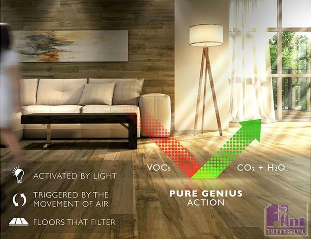 Очищать воздух сегодня умеют не только шторы, но и полы. Для этого деревянный материал напольного покрытия обрабатывают диоксидом титана, который действует как обеззараживающее средство, убивая при контакте с воздухом бактерии, вирусы, грибки и плесень. В помещении с таким полом формальдегиды, содержащиеся в воздухе, разлагаются на безопасные воду и углекислый газ.