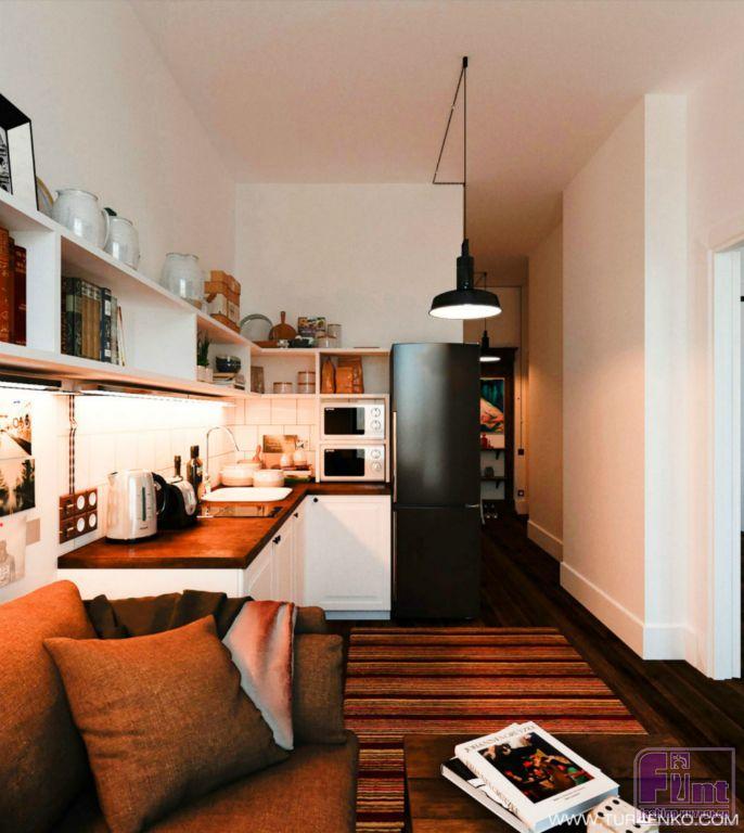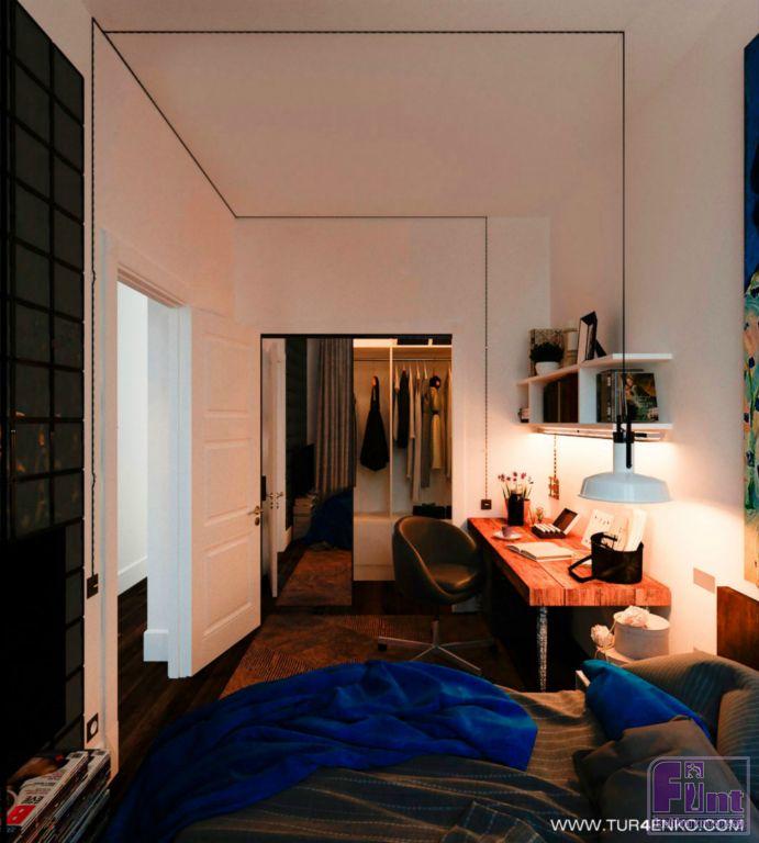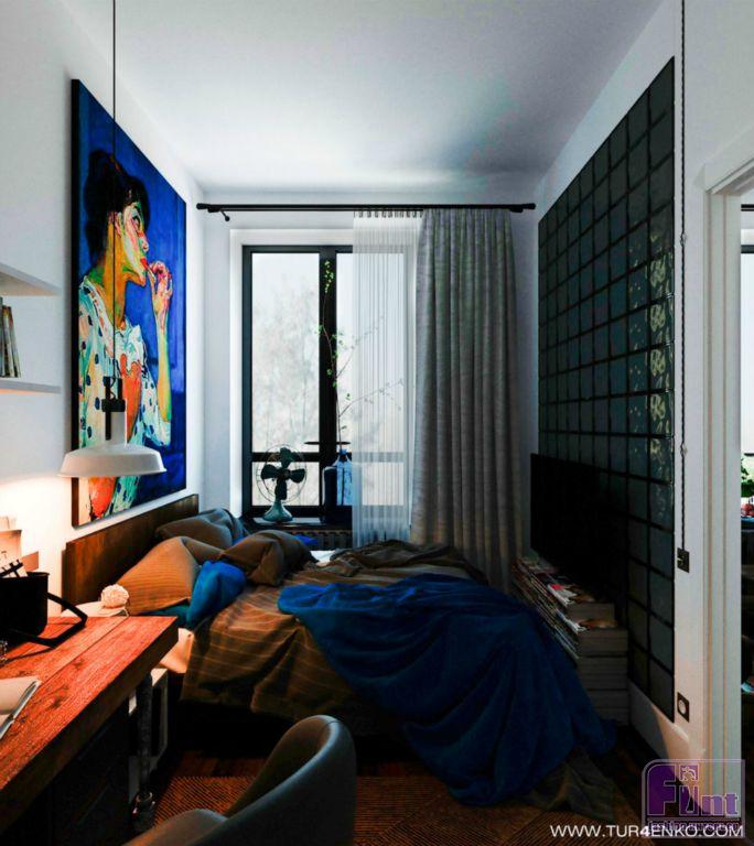Кровать Наталия планировала расположить у окна. Помимо удобной кровати в спальне нашло место для рабочей зоны и гардероба. Когда площадь небольшая, а хочется позволить себе много: и гостиную, и кухню, и отдельную спальню – то, по мнению Наталии, всё можно. Немного дизайнерской «магии» и задача будет решена. Так, Наталия решила использовать совсем небольшой минималистский кухонный гарнитур для своей кухни, чтобы оставить как можно больше свободного места в зоне приготовления и приёма пищи. Но в стремлении к минимализму не стоит забывать и о повседневном комфорте. Так, благодаря скромному по габаритам кухонному гарнитуру, в кухне-столовой перед телевизором появился уютный и вместительный диван с запасным спальным местом.