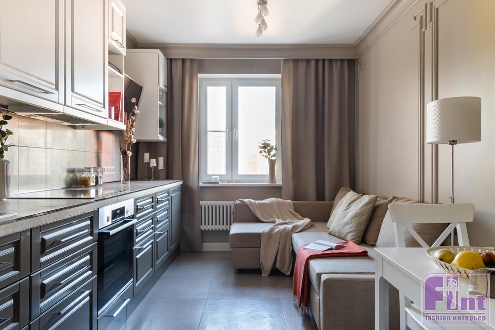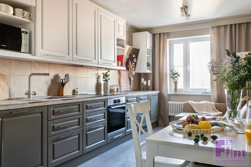 В результате тщательно продуманной перепланировки кухню объединили с гостиной, попутно найдя место и для зоны столовой. Гардеробную и рабочую зону организовали в спальне за счёт пространства лоджии. Со стилем тоже определились сразу: современный интерьер с классическими элементами. А чтобы визуально расширить пространство, выбрали светлую цветовую гамму.