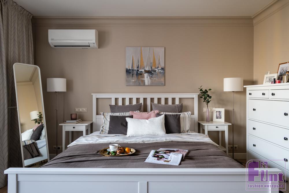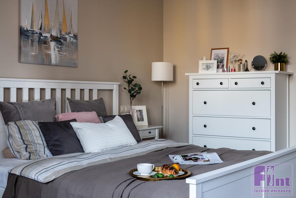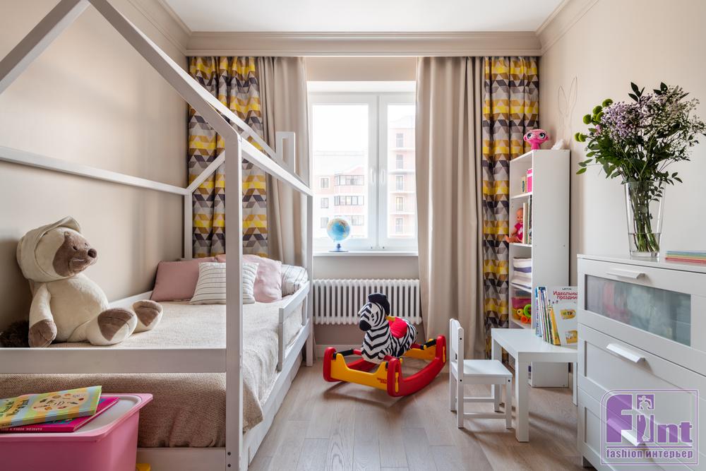 Ещё одним обязательным условием перепланировки стали отдельные спальные комнаты для всех членов семьи. В результате, появилась удивительно уютная и стильная детская комната, выполненная в общей цветовой гамме проекта. Исключение составил яркий цветовой акцент, добавленный дизайнером за счёт пёстрых штор с классическим орнаментом «ромбы и треугольники». Такой орнамент довольно часто дизайнеры используют в интерьерах, выполненных в скандинавском стиле.