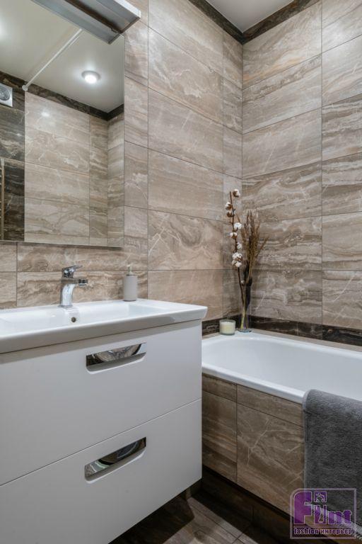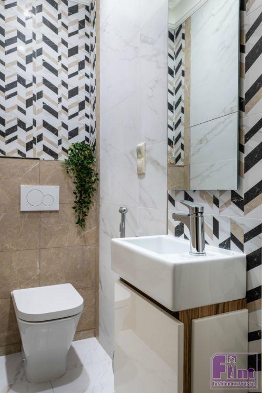Раздельный санузел выполнен в общей цветовой гамме всего интерьера квартиры. Стены и пол выложены керамогранитом в натуральном коричнево-бежевом цвете. Туалетная комната дополнена собственной компактной раковиной, а стены украшены панно из керамической плитки с орнаментом «ёлочка». В довольно скромном по габаритам туалете дизайнеру пришлось добавить вертикальные полосы из светлого керамогранита, чтобы помещение не выглядело слишком тесным.