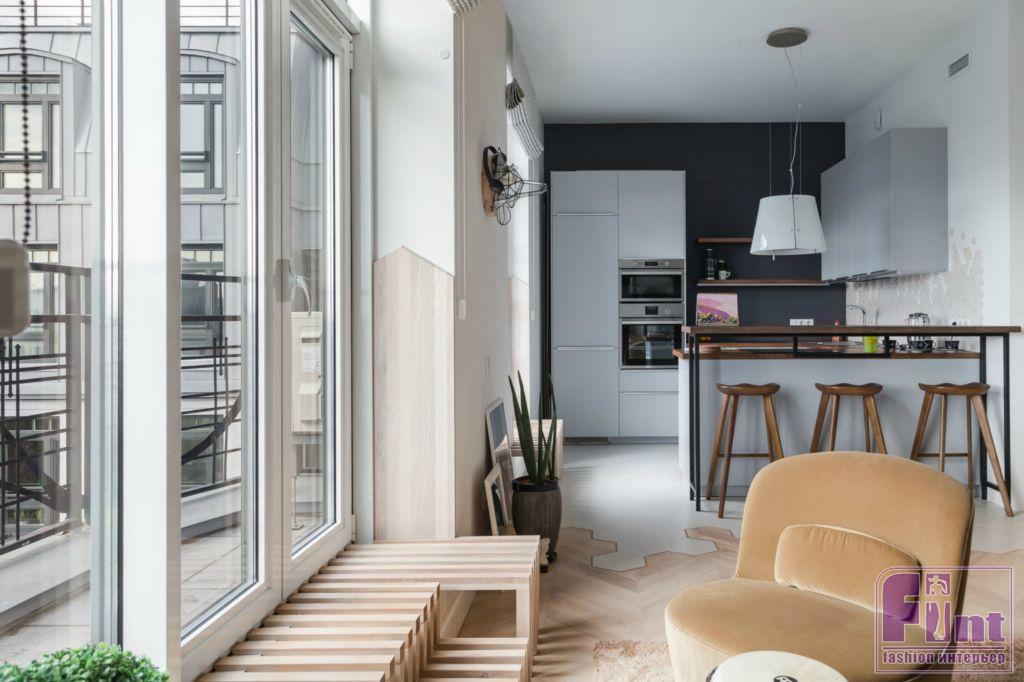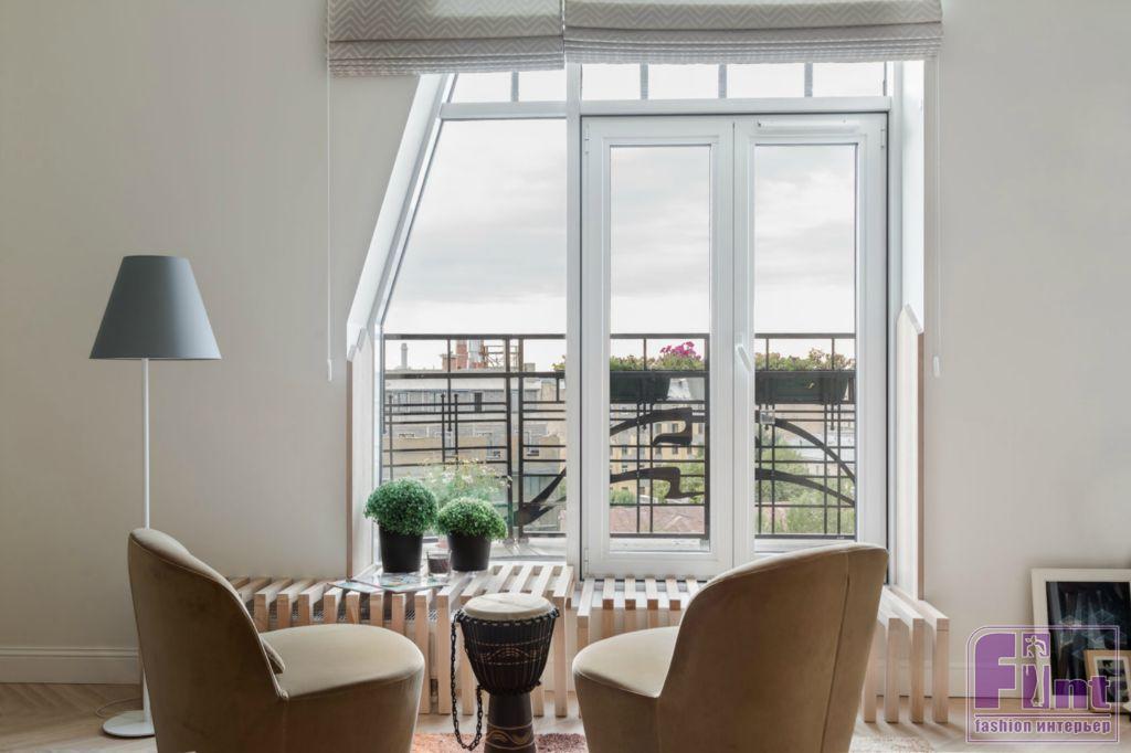 В итоге в квартире появились отчерченные функциональные зоны: творческая зона с дубовой столешницей и мягким естественным светом, лаундж-зона с видом на крыши Петербурга, кухонный уголок с барной стойкой и особое пространство, названное автором «Посиделки». «Посиделки» — это проект в проекте, который представляет собой реечки, закрывающие все радиаторы в кухне-гостиной. Здесь можно удобно расположиться с чашечкой чая, наблюдая потрясающий вид на живописные крыши исторического района Санкт-Петербурга.