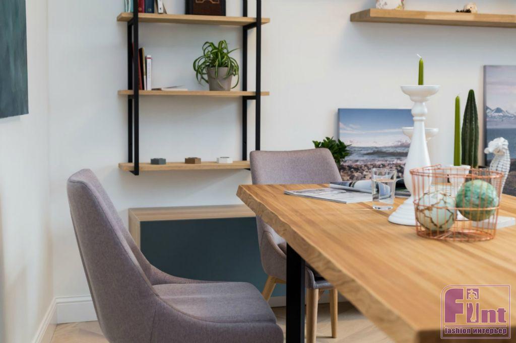 У окна удобно расположились деревянные скамейки-реечки, перекрывающие радиаторы. Большая столешница на индивидуально изготовленных подстольях задумана как место для работы и учебы. Кухня отделена от гостевой зоны барной стойкой, заменяющей в этой квартире классический обеденный стол.