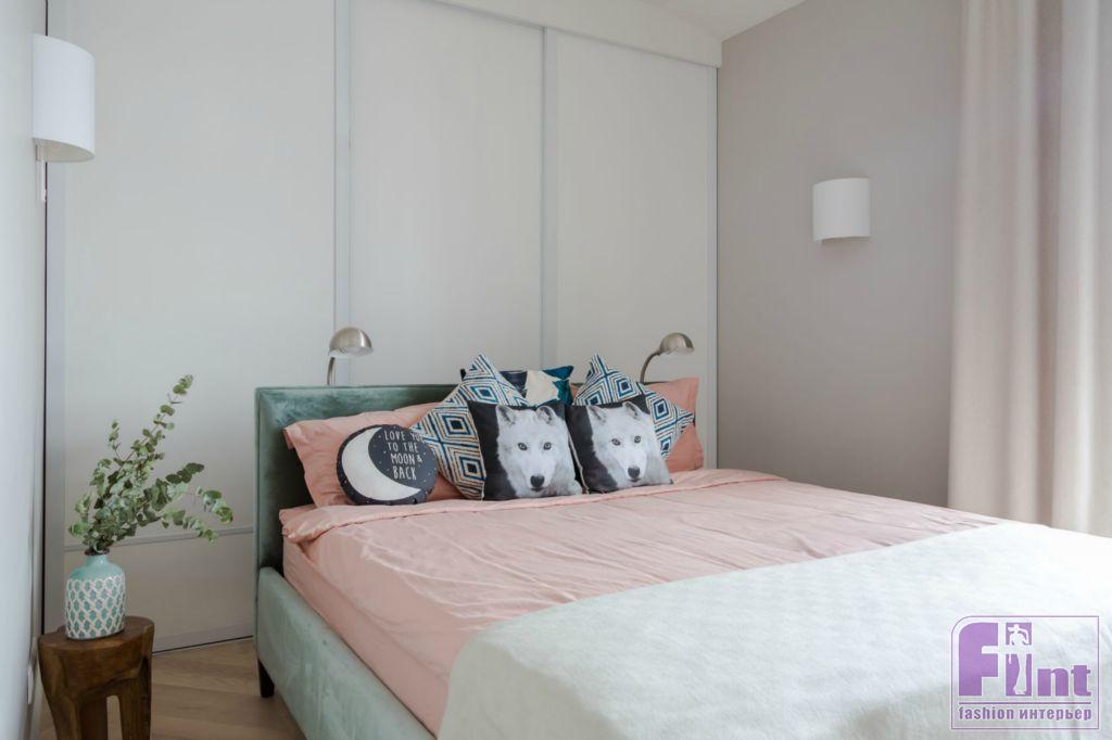 Спальню для хозяйки авторы проекта называют «норкой для полярного песца». В оформлении этой комнаты использованы более тёмные арктические цвета и натуральные материалы, чтобы получить эффект «ныряния в норку». Деликатно дополняет интерьер хозяйской спальни прелестная и изящная кушетка цвета пыльной розы, установленная около окна, напротив кровати.