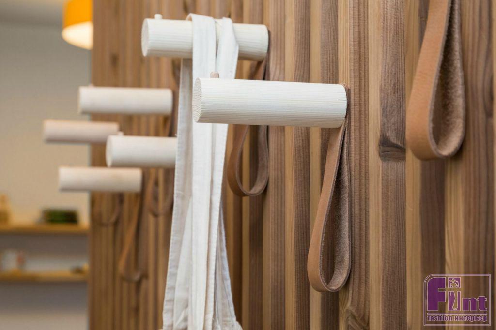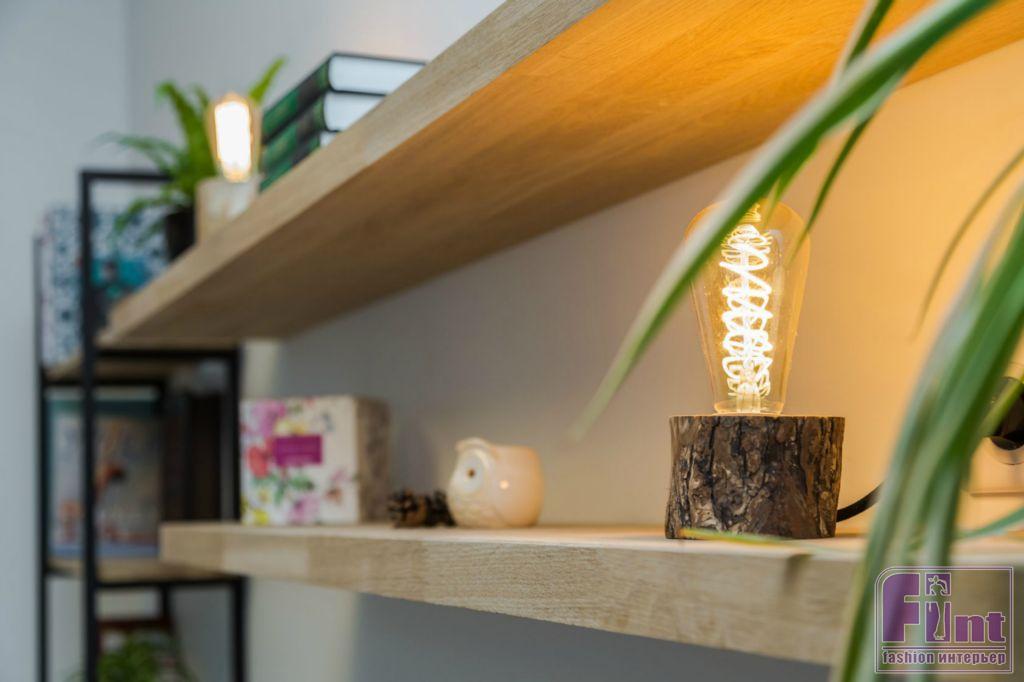 «По индивидуальным чертежам была заказана межкомнатная дверь высотой от пола до потолка, вдохновлённая дверями во дворце Бобринских, в котором училась на тот момент заказчица. По нашим эскизам сварили каркас для барной стойки, книжные полки, подстолье рабочего стола. Рейки на стенах и потолке в коридоре выполнены из термобруса», — рассказывает Ульяна Скапцова.
