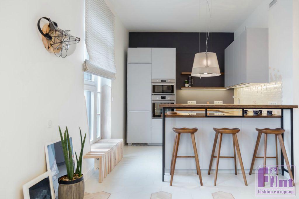 У окна удобно расположились деревянные скамейки-реечки, перекрывающие радиаторы. Большая столешница на индивидуально изготовленных подстольях задумана как место для работы и учебы. Кухня отделена от гостевой зоны барной стойкой, заменяющей в этой квартире классический обеденный стол.