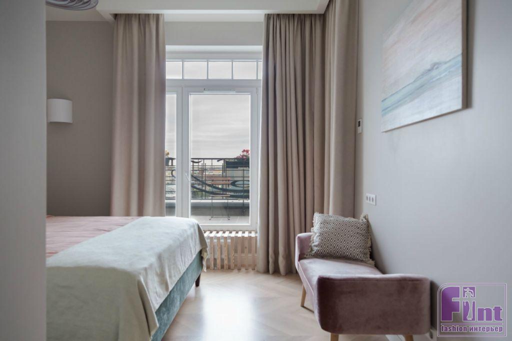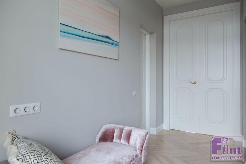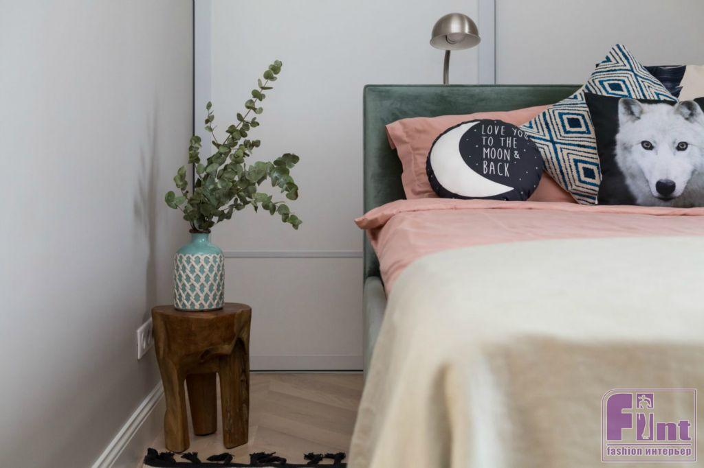 Спальню для хозяйки авторы проекта называют «норкой для полярного песца». В оформлении этой комнаты использованы более тёмные арктические цвета и натуральные материалы, чтобы получить эффект «ныряния в норку». Деликатно дополняет интерьер хозяйской спальни прелестная и изящная кушетка цвета пыльной розы, установленная около окна, напротив кровати.