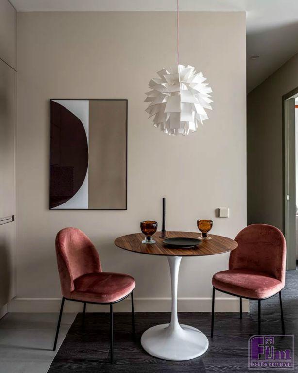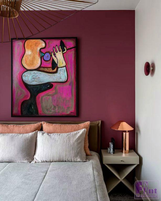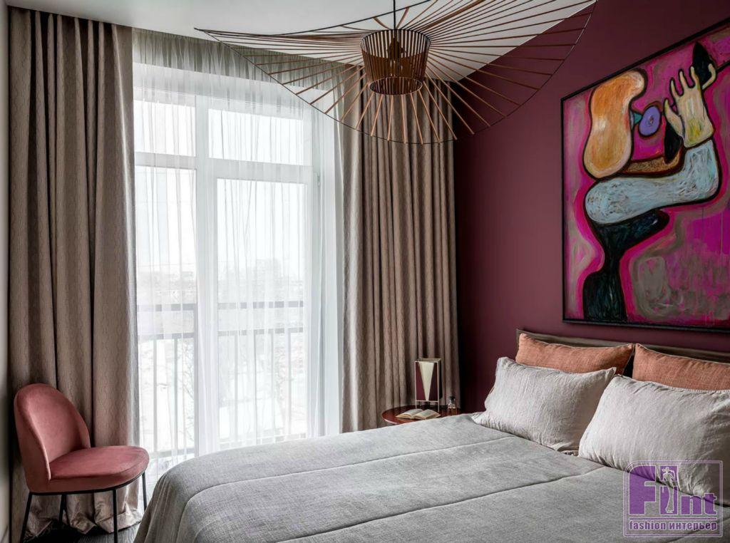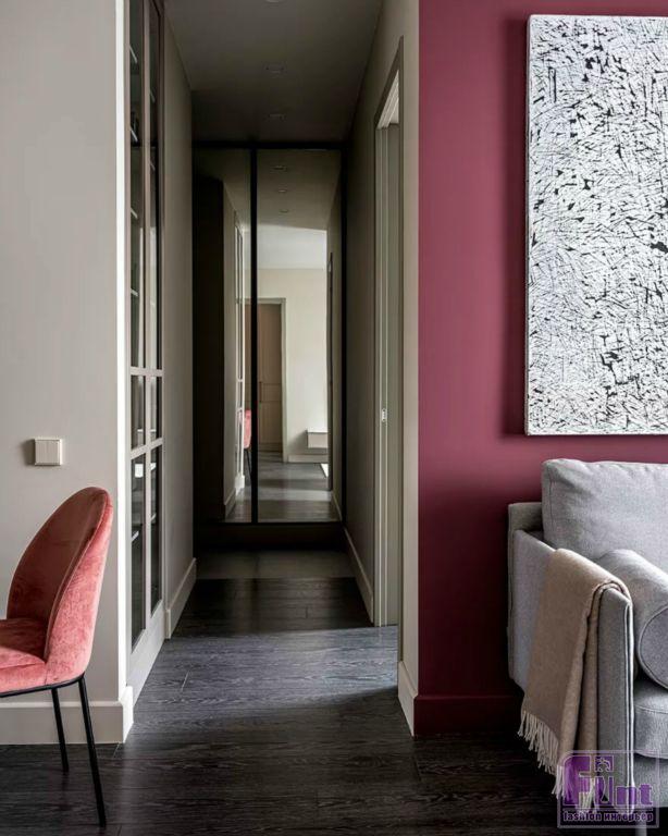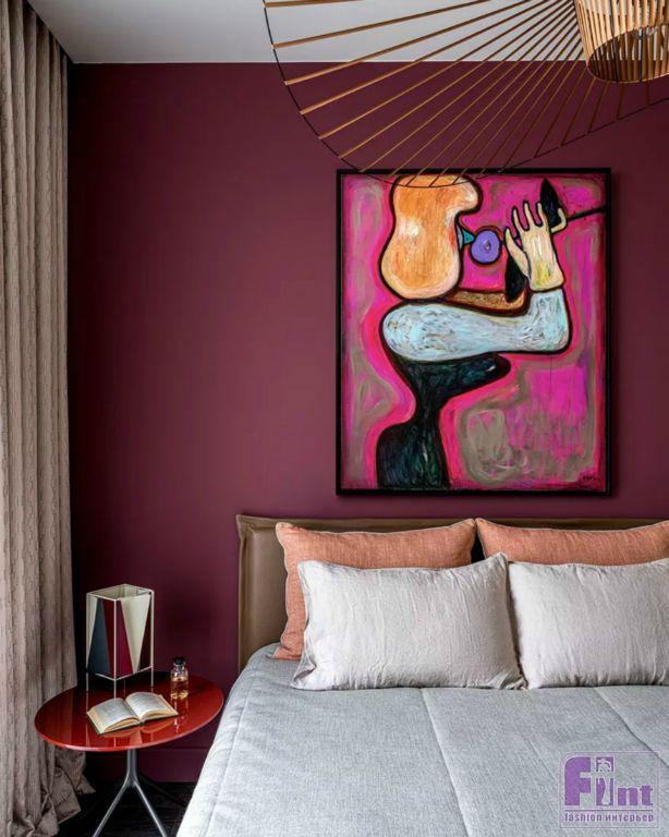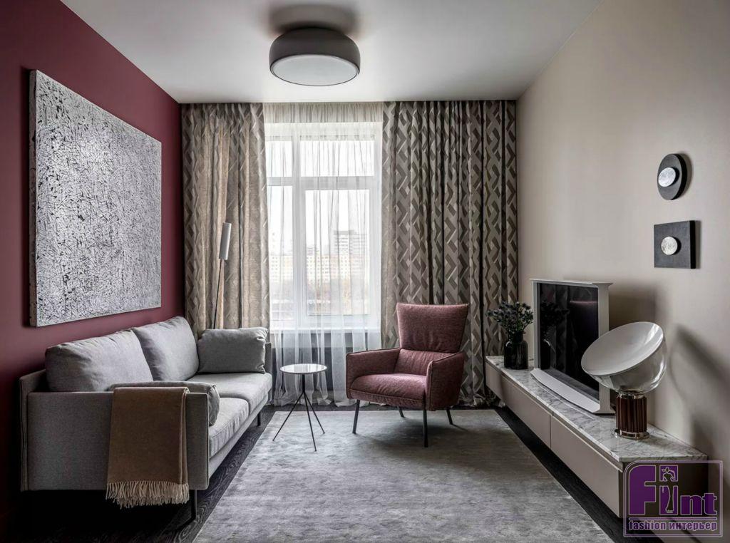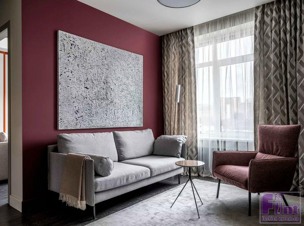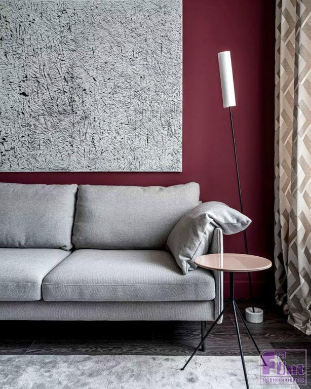 Комнаты в этой небольшой квартире были вытянутыми и узкими. Чтобы максимально объединить пространство кухни-гостиной и спальни, автор предложил использовать сложные насыщенные цвета. В выбранный глубокий винный оттенок выкрасили акцентную стену над диваном в гостиной и такую же акцентную поверхность за изголовьем в спальне.
