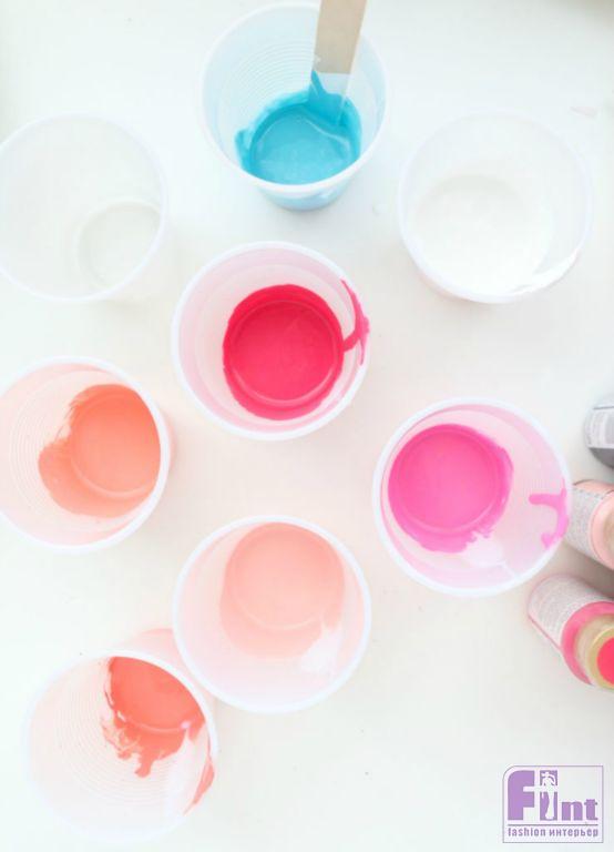 Отлейте понемногу каждой краски в одноразовые стаканчики (примерно по 50-60 граммов). Добавьте в каждый стаканчик с краской заливочную среду в соотношении один к одному и тщательно перемешайте.