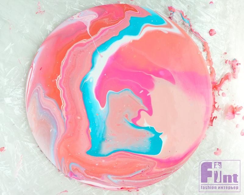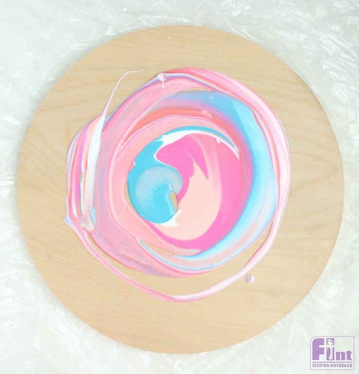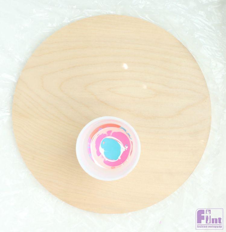 После того, как все краски будут смешаны в одном стакане, аккуратно вылейте красочную смесь на подготовленный деревянную круглую основу. Убедитесь, что поверхность под вашей деревянной основой надёжно защищена от подтёков краски (используйте полиэтиленовую плёнку).