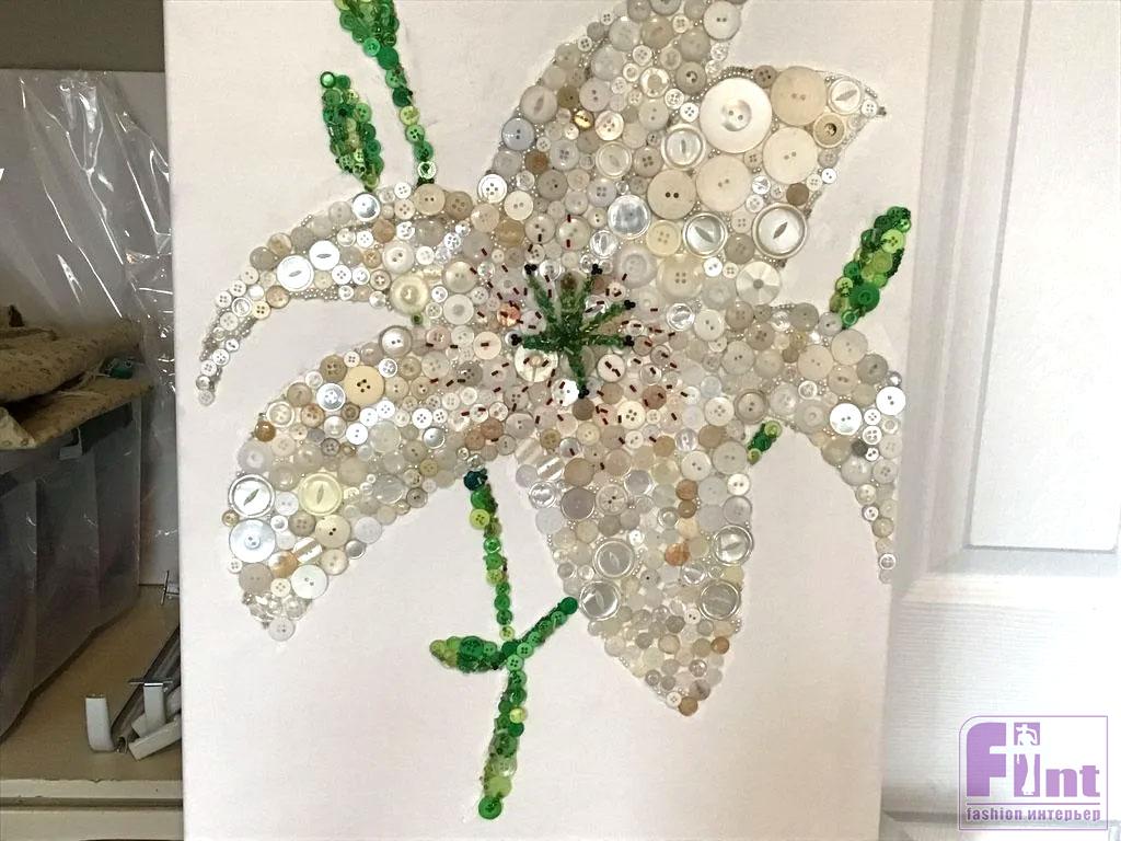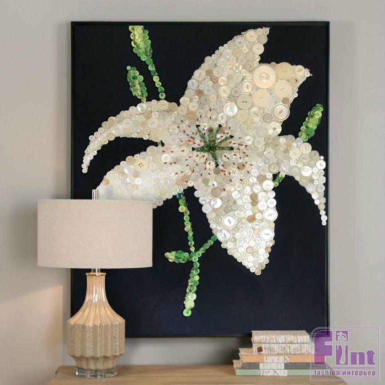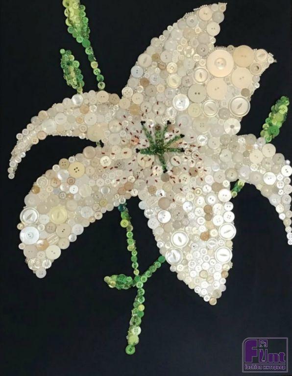 Цветы любят все, поэтому мы решили использовать для панно цветочную тему. Мы выбрали цветок с красивой натуральной текстурой лепестков и листьев, по цвету подходящий под цвет пуговиц, которых у вас больше всего (обычно, по невероятному стечению обстоятельств, это белые пуговицы). В итоге наш выбор пал на белую лилию. Лилии имеют отличную текстуру на листьях и лепестках, что позволит нам воссоздать этот удивительно красивый цветок на полотне.