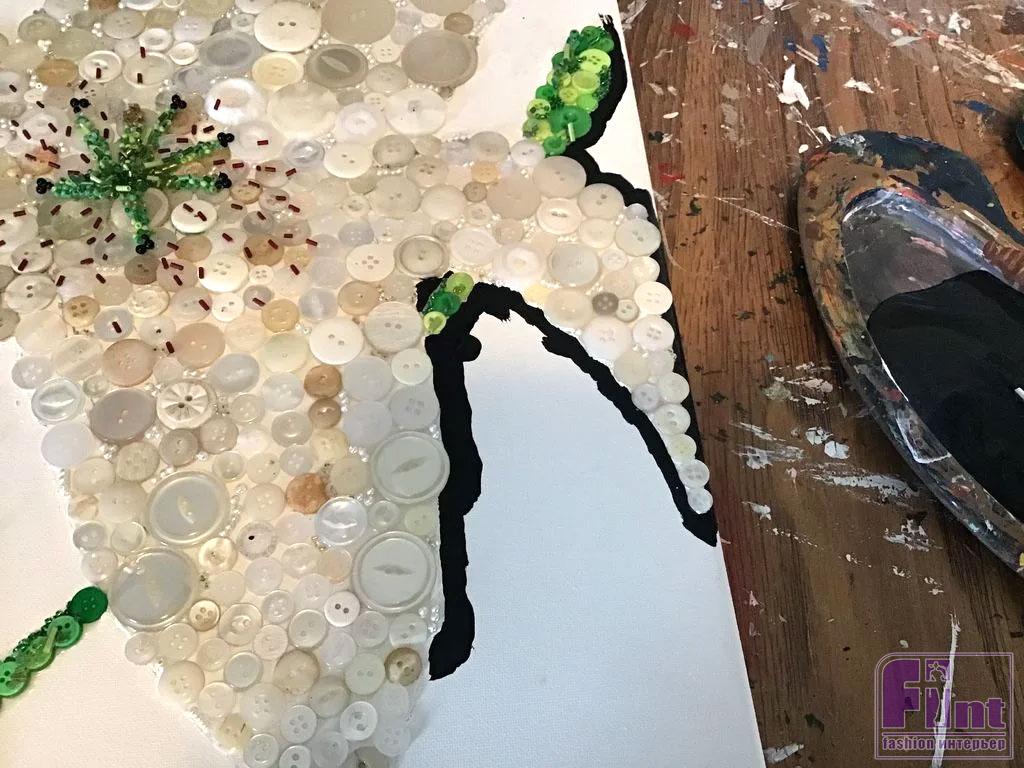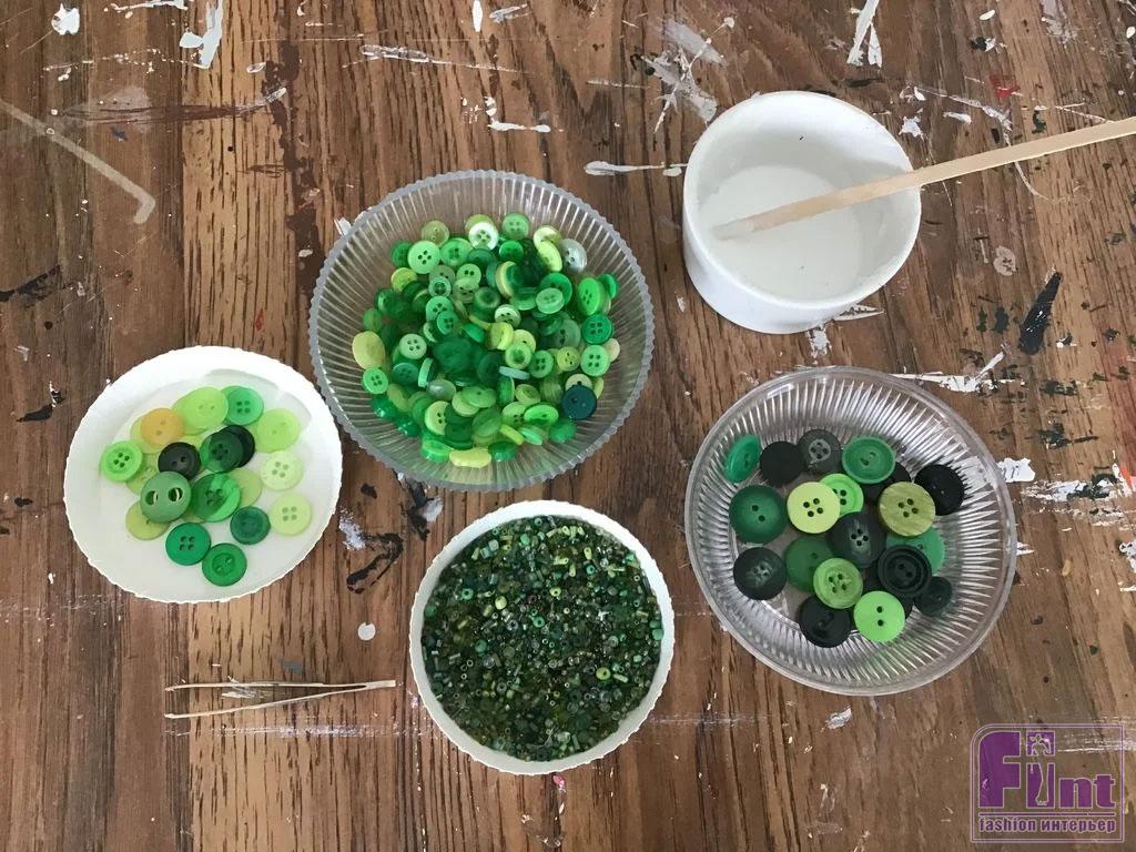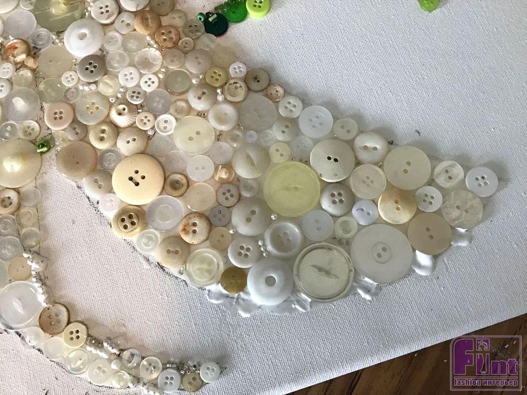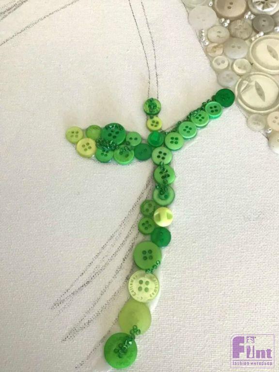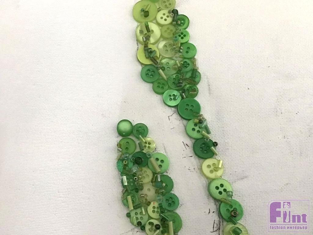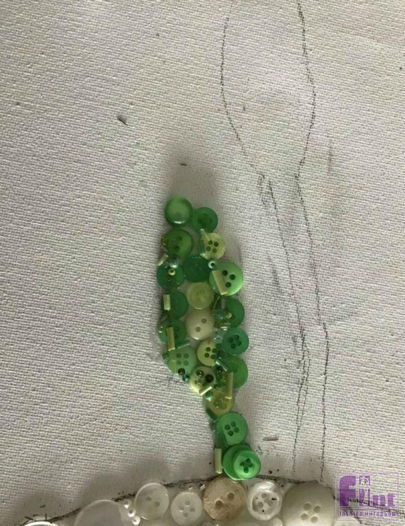 Укладку зелёных пуговиц по контуру стеблей начните также снизу. Нанесите немного клея на холст и приступайте к укладке зелёных пуговиц. Свободное пространство между пуговицами вы можете, как и в предыдущем шаге, заполнить бисером или бусинками подходящего зелёного оттенка.