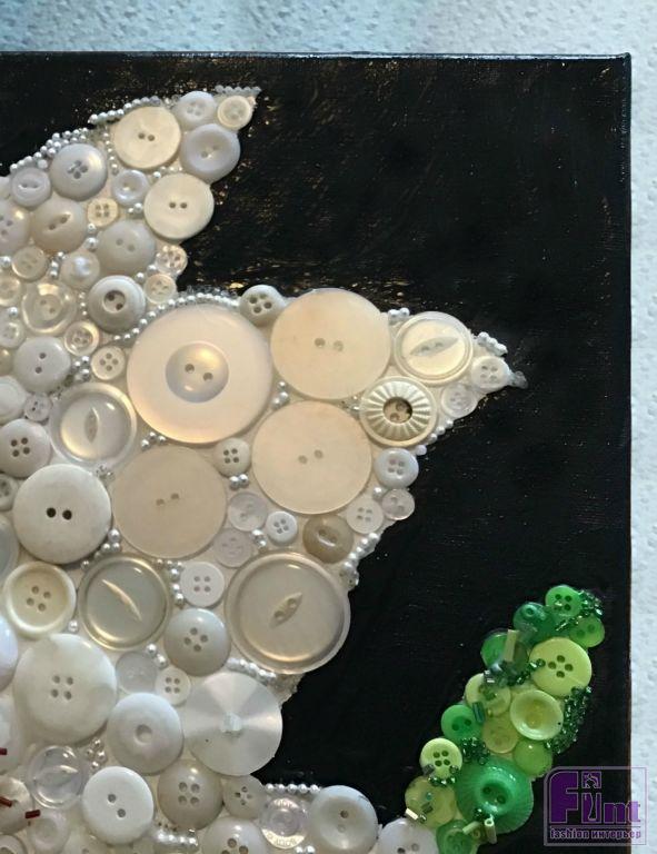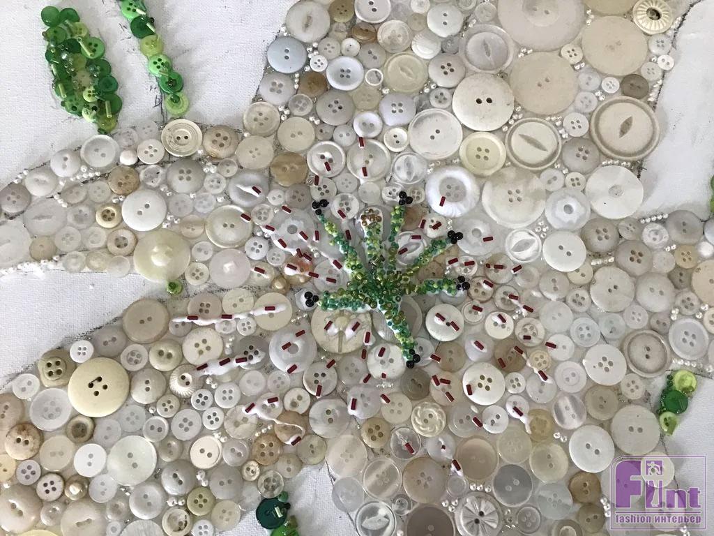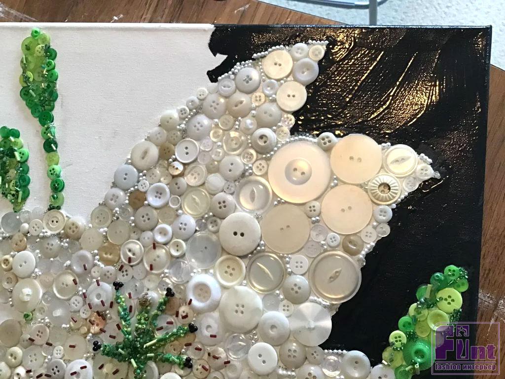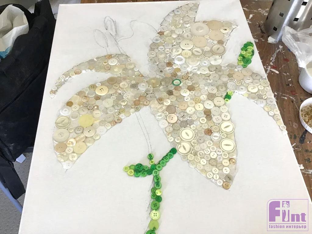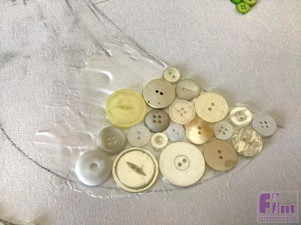 Укладку зелёных пуговиц по контуру стеблей начните также снизу. Нанесите немного клея на холст и приступайте к укладке зелёных пуговиц. Свободное пространство между пуговицами вы можете, как и в предыдущем шаге, заполнить бисером или бусинками подходящего зелёного оттенка.