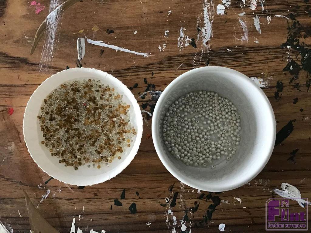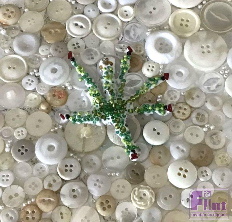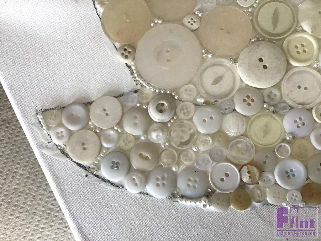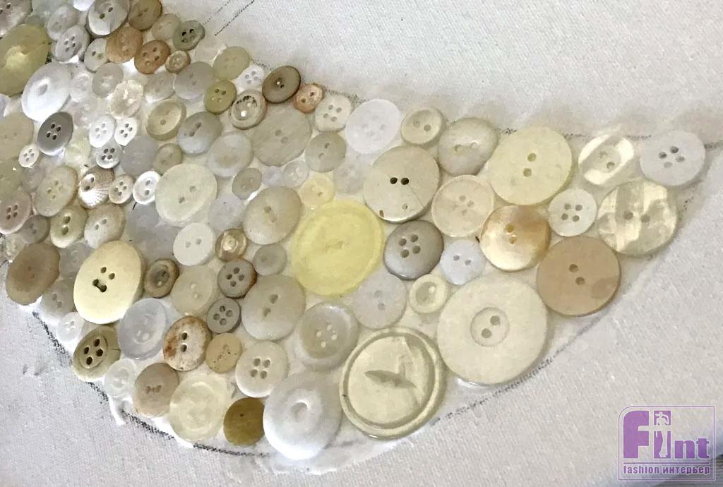 После того, как вы уложите белые пуговицы по контуру лепестков лилии, вы увидите промежутки между ними. Попробуйте заполнить эти пробелы с помощью совсем маленьких пуговиц, или используйте бусинки белого или жемчужного цвета. С помощью такого приёма мы создадим красивую текстуру на лепестках.