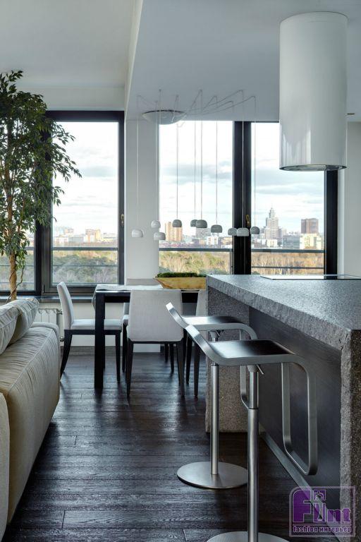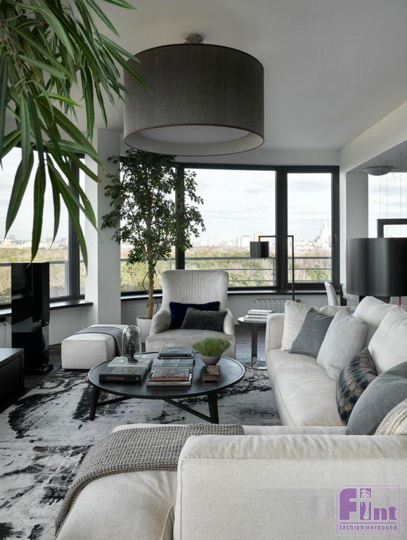 Пятикомнатная квартира расположена в высотном жилой комплексе на северо-западе Москвы. Помимо внушительной площади — 250 кв. м, апартаменты отличала весьма необычная планировка с полукруглой стеной в гостиной. Из панорамных окон открывается роскошный вид на лесопарк, тактично оттенённый практически монохромной палитрой интерьера.