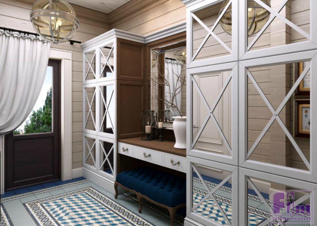 При входе в дом гостей встречает яркая прихожая. В ней дизайнер не забыла о функциональности, большая часть которой спрятана в гардеробе. Ванную комнату разгрузили от бытовой утвари и техники, также переместив их в гардероб. Таким образом, в ванной сохранилось достаточно пространства для релакса и отдыха.