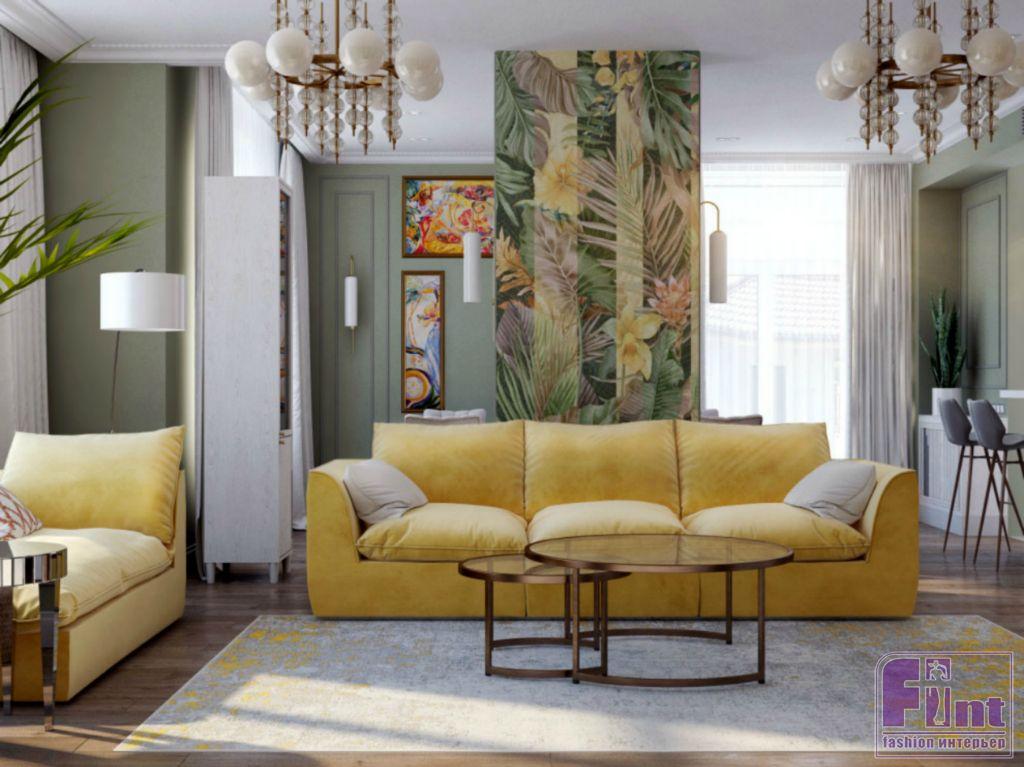«Помещение достаточно большое, с большими окнами, темно не будет. Но на более тёмном фоне стен светлая мебель смотрится особенно торжественно, а яркие элементы вносят жизнерадостное солнечное настроение», — рассказывает дизайнер. Цветовые акценты, умело применённые дизайнером, также обуславливают правильную тональность восприятия интерьера. Яркая мебель и акцентная стена в гостиной перекликаются с триптихом из картин хозяев дома.