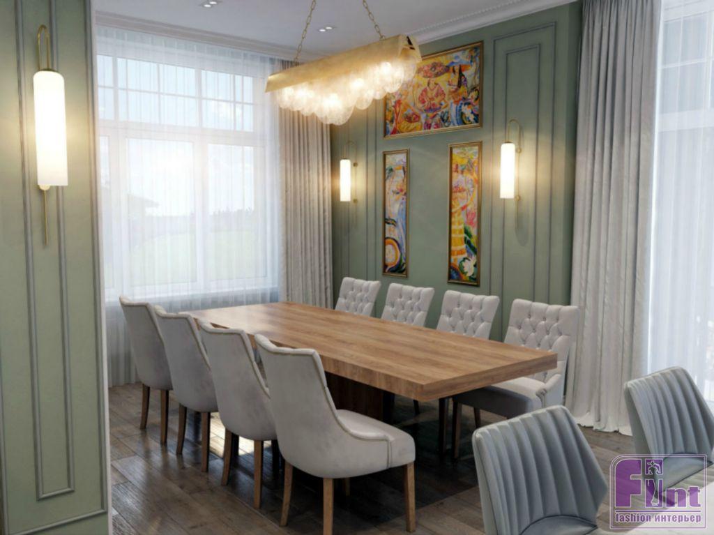 В центре дома всё вращается вокруг картин заказчиков — триптиха в ярких жизнерадостных цветах. Стены гостиной было решено выкрасить в приглушённый оттенок зеленого тона, на фоне которого картины засияли ещё больше. В игру света в гостиной комнате включаются зеркала, упирающиеся в потолок, что создает ощущение многомерности помещения.