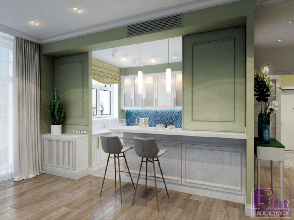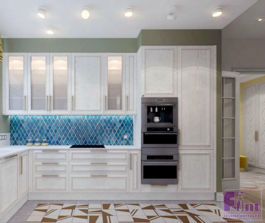 Кухня для этого проекта была выполнена на заказ под размеры помещения. Кухонный фартук бирюзового цвета оживляет сдержанный интерьер, оттеняя светлый массив гарнитура, полок и шкафов. Родительская спальня внешне выглядит, как самое классическое помещение квартиры, поскольку в ней дизайнер использовала много элементов, присущих этому сдержанному по эмоциональности стилю.